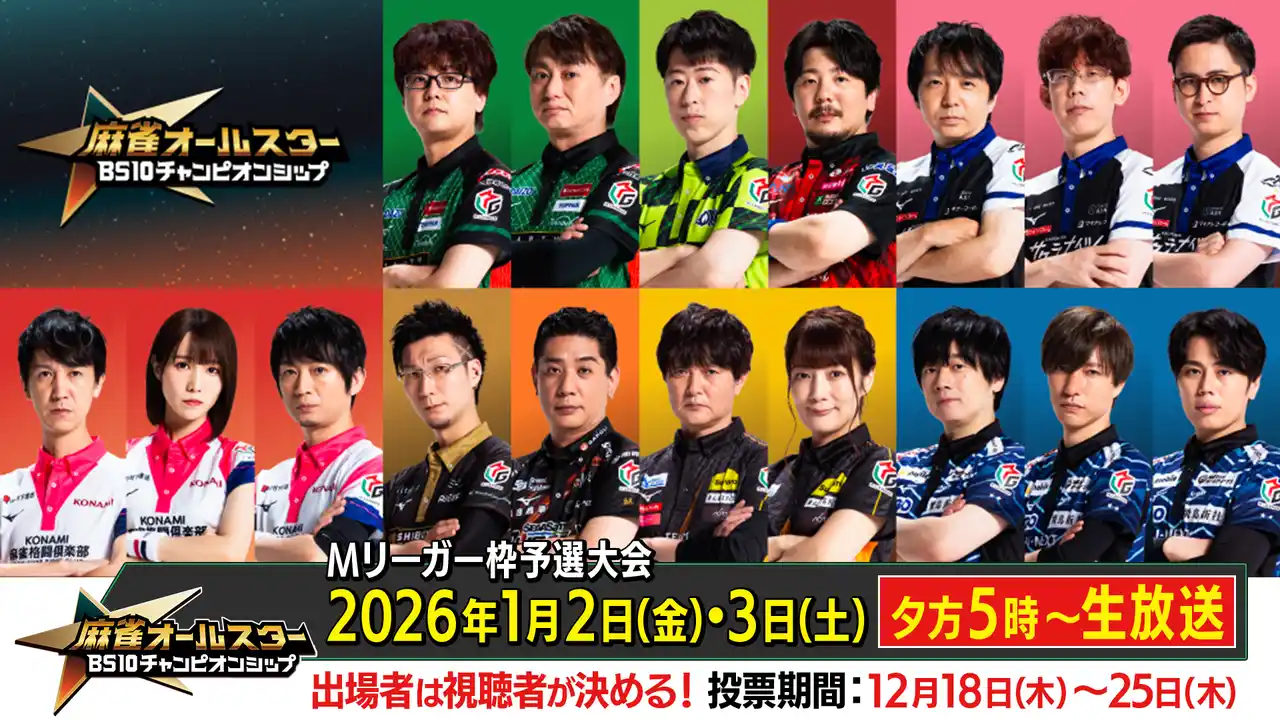 『麻雀オールスター BS10チャンピオンシップ2026 Mリーガー枠予選大会』 ・放送日時:2026年1月2日(金)、3日(土)夕方5:00~よる11:00 ・出場選手:投票で選出されたMリーガー8名 |