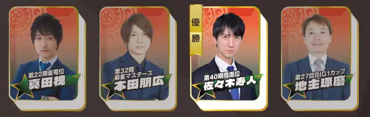 | 1年間を通して32名のタイトルホルダーやMリーガー、著名人雀士が生放送で戦う、現行の麻雀大会では日本一の賞金額となっている麻雀対局大会! 今大会で勝ち上がったMリーガー2名が本戦への出場枠を獲得します。 | |||||||||