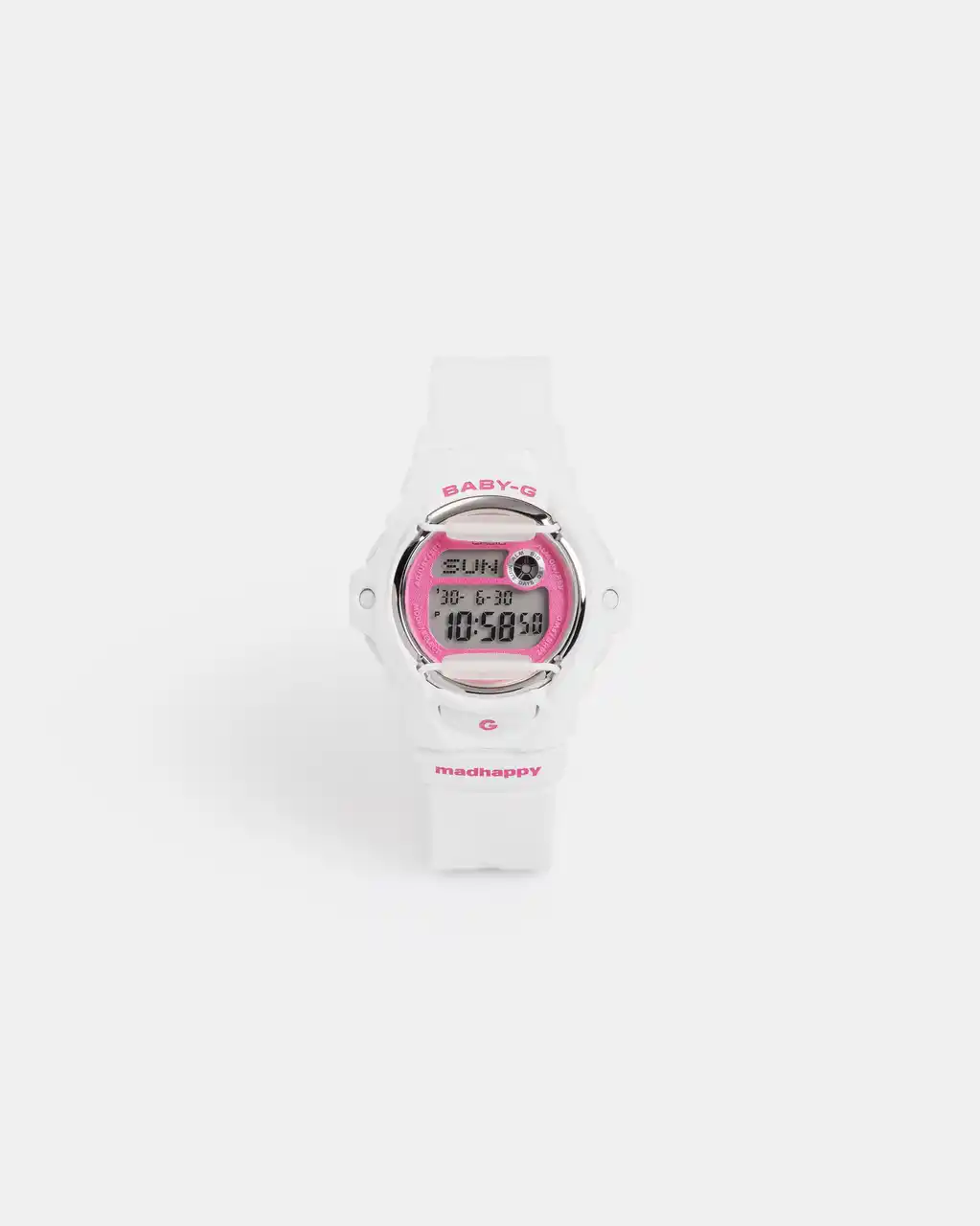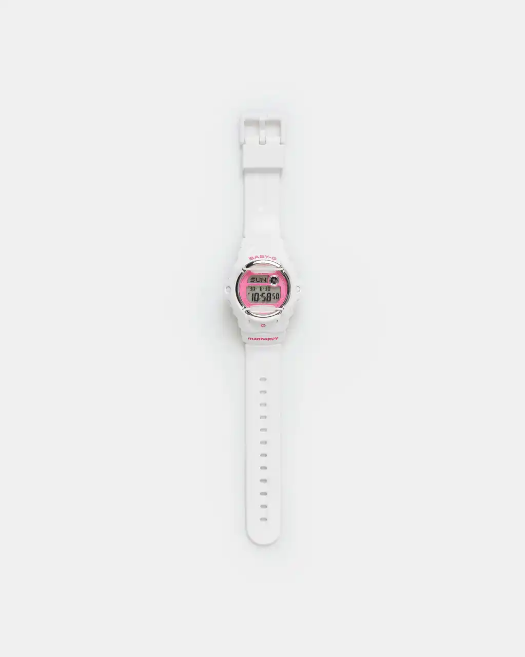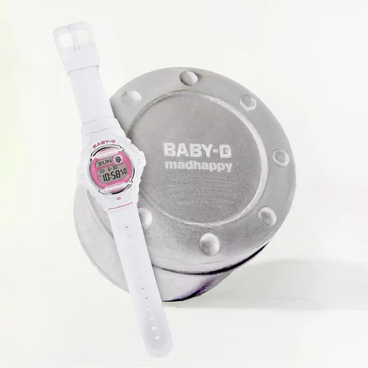 本作は、レトロフューチャーなデザインで知られる「BG-169」をベースにした特別仕様モデル。BABY-Gが誇るタフネスと自己表現の精神を軸に、Madhappyの“楽観主義”という視点で再解釈し、ノスタルジーと前進するエネルギーの融合を表現しています。