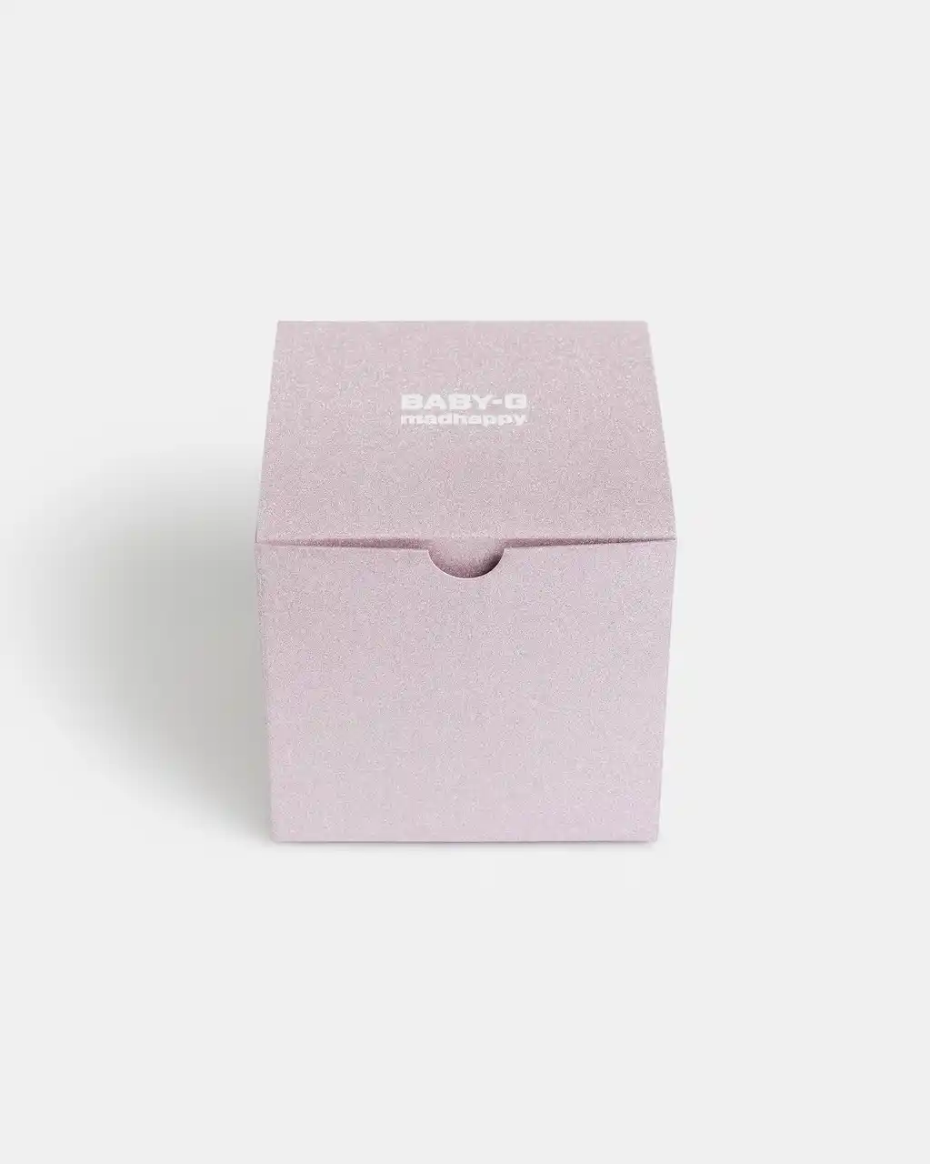 やわらかなピンクの文字盤と、クリーンなホワイトのケース&バンドのコントラストが、明るく軽やかな印象を演出。裏蓋にはMadhappyのロゴを刻印し、LEDバックライトを点灯させると、LCDディスプレイ上にMadhappyロゴのシルエットが浮かび上がる特別仕様となっています。さらに、本コラボレーション限定のカスタム・コーブランディングパッケージが付属します。 |