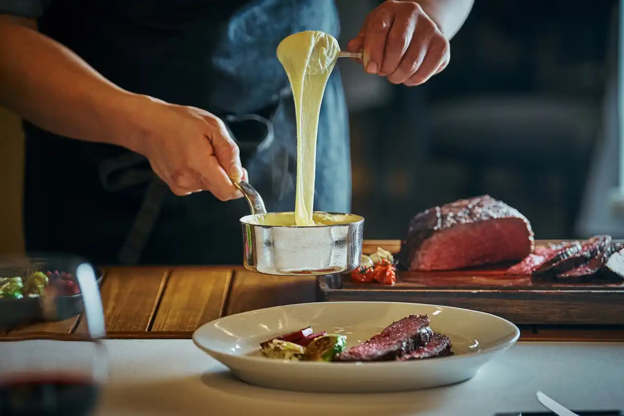 まずは何も付けずに肉本来の味わいを満喫したあと、赤ワインソースとグリーンペッパーソース、2種類の自家製ソースで味の変化をお楽しみいただくのがシェフのお勧めです。付け合わせには、グリルした冬野菜とアリゴポテトをご用意いたします。アリゴポテトは、きめ細かく滑らかな口当たりに仕上げる自家製マッシュポテトに、ストラッチャテッラとゴーダ、2種類のチーズを合わせた濃厚な味わいで、ワインやビールが思わずすすむ一品です。 |