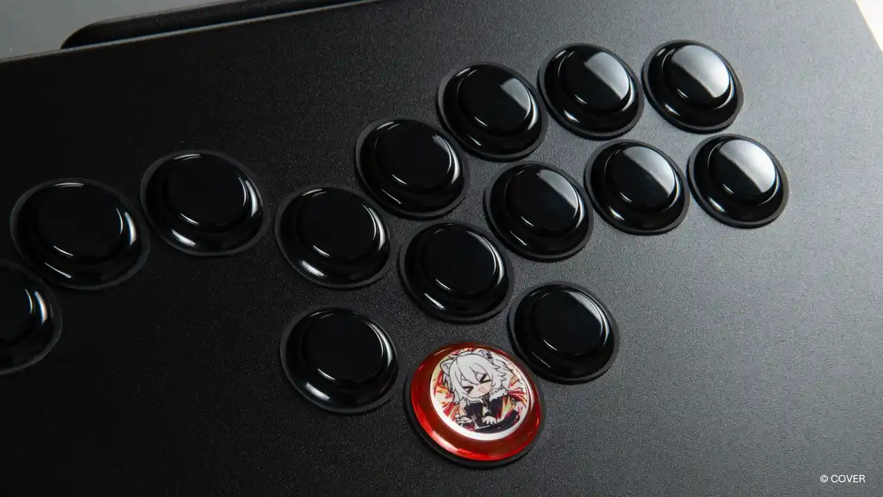 アケコンの交換ボタンとして使用可能な「獅白ぼたんボタン」がついに登場。三和電子製のアケコン用交換ボタン(30φ)に、描き下ろしのイラストや本イベントのロゴをあしらった特別デザイン。ストラップとしても使える2WAY仕様です。 |
