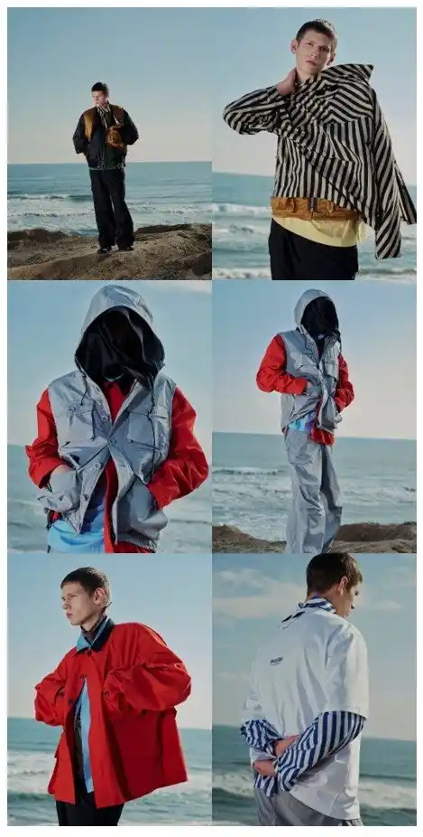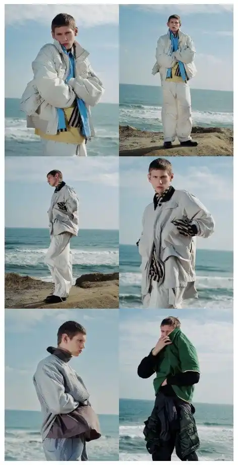 砂丘や海岸で撮影したビジュアルでは、砂と空、海と風が描く“揺れる水平線”が、服がつくるラインと重なり、シルエットの見え方に新しい焦点を与えている。 |