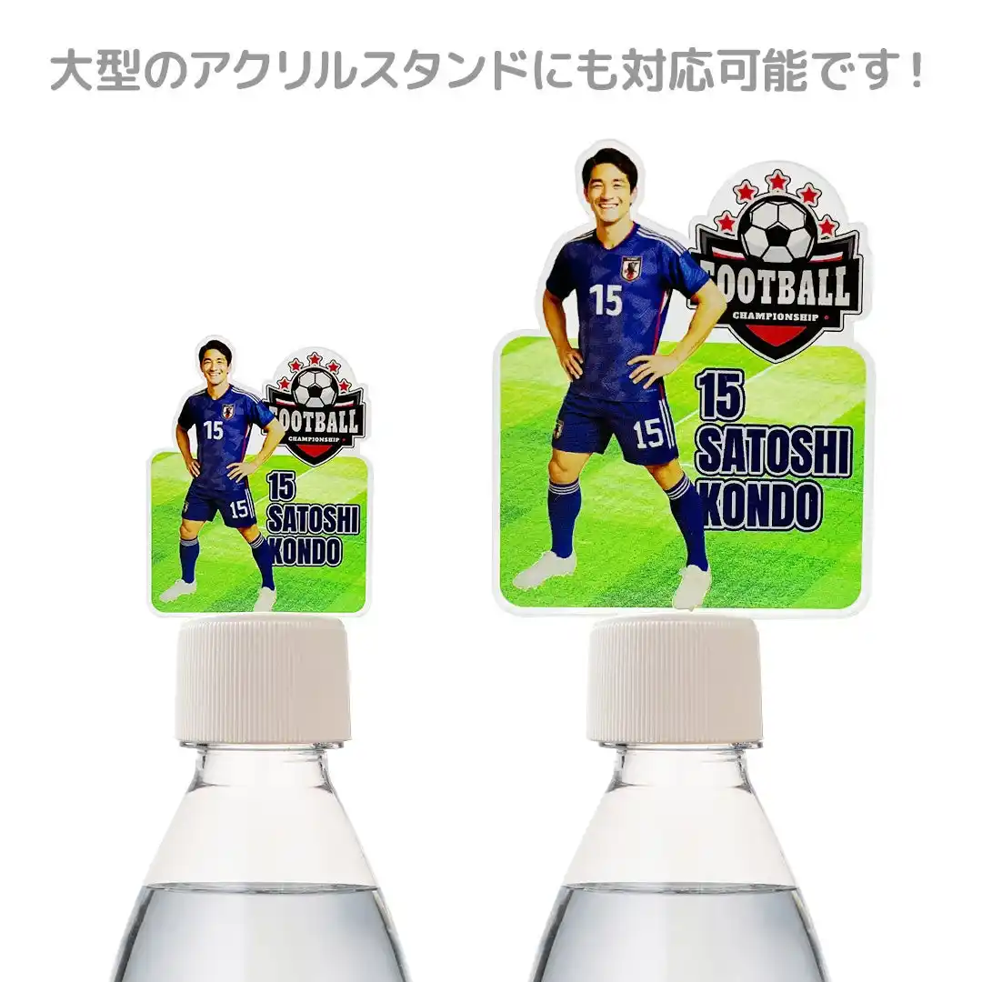 オリジナル ボトルキャップアクスタは、大型サイズのアクリルスタンドにも対応し、迫力あるグッズ制作が可能です。 キャラクターの全身イラストやスポーツ選手・アイドルのビジュアルなど、細部までこだわったデザインを大きく見せたい場合にも最適。 |