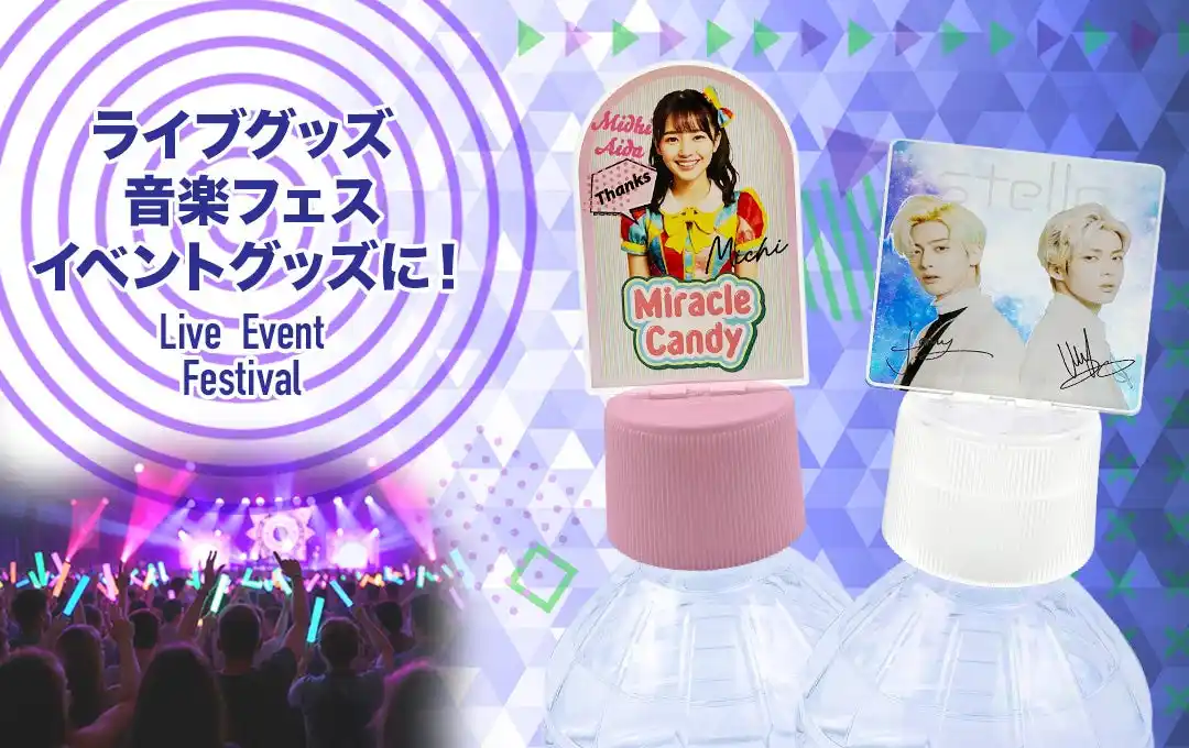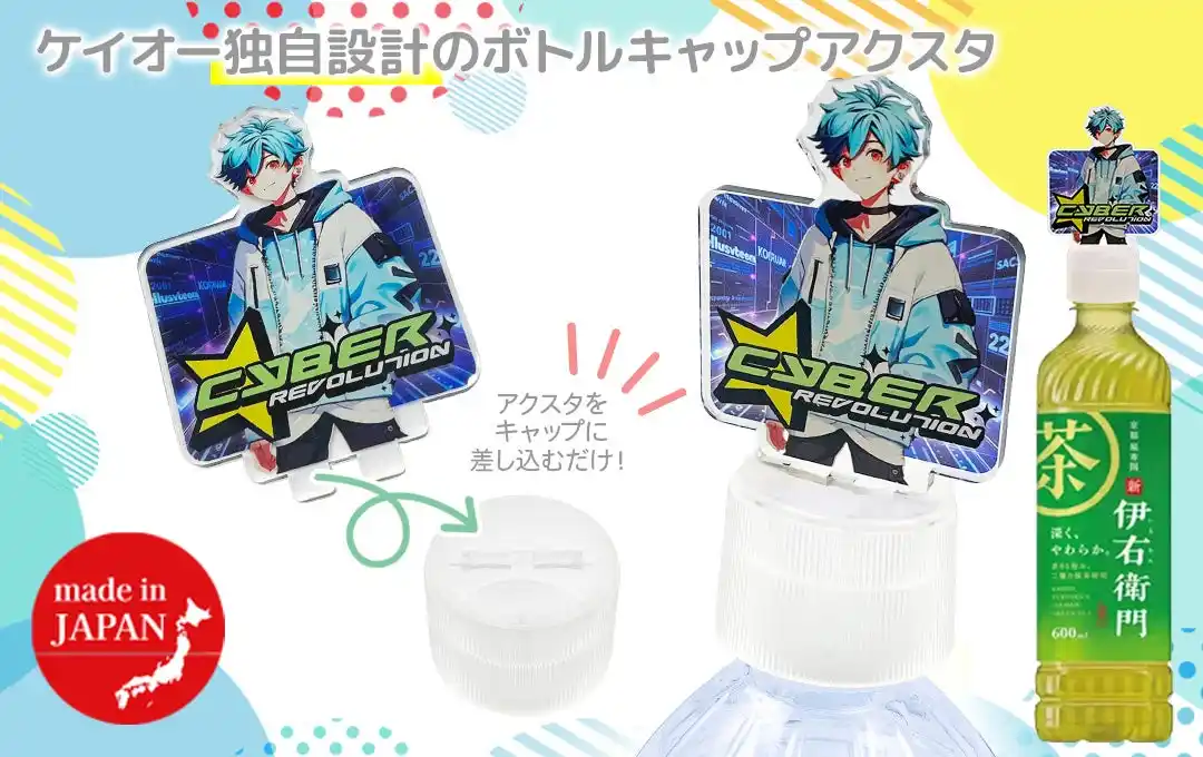 ケイオー独自設計の「ボトルキャップアクスタ」は、専用ボトルキャップとアクリルスタンド本体がセットになった新しいスタイルのオリジナルグッズ。(商標登録&特許出願中)