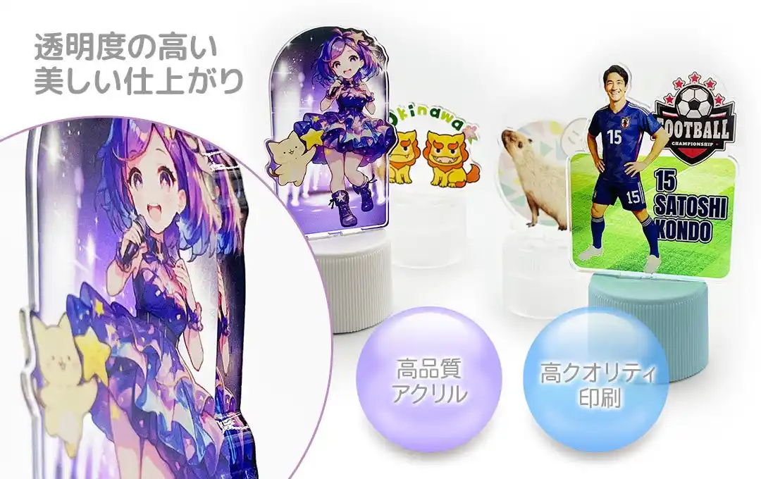 アクスタ部分には、透明度が高く耐久性にも優れたクリアアクリルを採用しており、透き通るような美しさがキャラクターやロゴの魅力を最大限に引き立てます。 UVインクジェットによる高精細フルカラー印刷で、細かなライン・鮮やかな色彩・繊細なグラデーションまで美しく再現できるので、公式グッズやイベント物販、同人作品など販売用アイテムとしても十分なクオリティを持ち、コレクション性の高い仕上がりです。 |