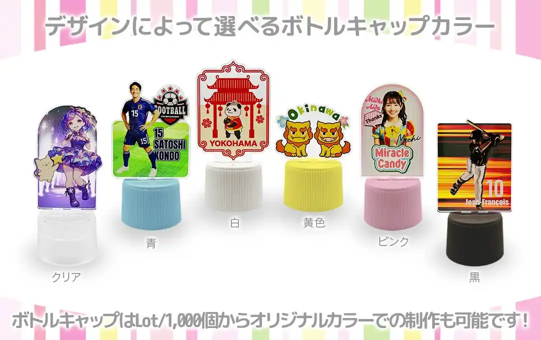 ボトルキャップ部分は、透明感のあるクリアの他、白・黒・ピンク・黄色・青(いずれも不透明)の全6色をご用意しています。 「クリア」は軽やかで抜け感のある印象になり、アクスタの持つ透明感との組み合わせが美しい仕上がりに。不透明カラーは淡い色調のデザインもくっきり際立たせ、存在感のある仕上がりになります。 豊富な色展開により、キャラクターのテーマカラー、作品イメージ、ブランドカラーなどに合わせた最適なコーディネートが可能となり、グッズ全体の統一感を高められるのも大きな魅力。 また、最低ロット1,000個以上であれば、オリジナルカラーでの制作も可能です! |