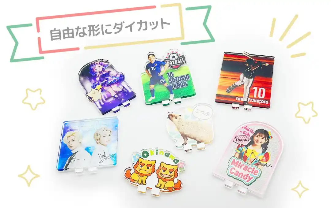 アクリルをダイカットして、キャラクターのシルエットやアーティストの衣装、スポーツ選手の動きのあるポーズなど、デザインの魅力をそのまま活かした形状で制作できます。 造形の自由度が高いことで“推しの個性”を余すことなく反映でき、国内生産による高品質仕上げで、ファングッズとしての満足度やコレクション性も大きく向上します。 |
