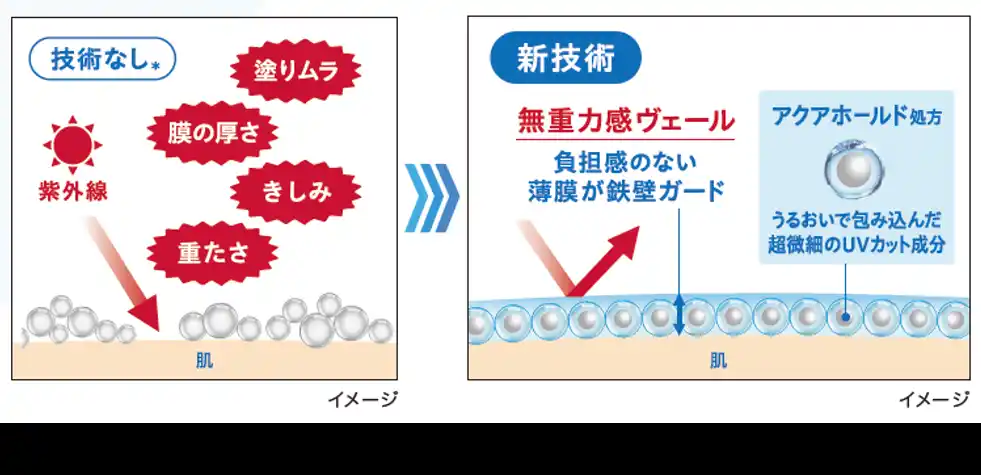 超微細のUVカット成分※1が均一に並ぶことでミクロレベルの隙間までうめて塗りムラを防ぎます。 |