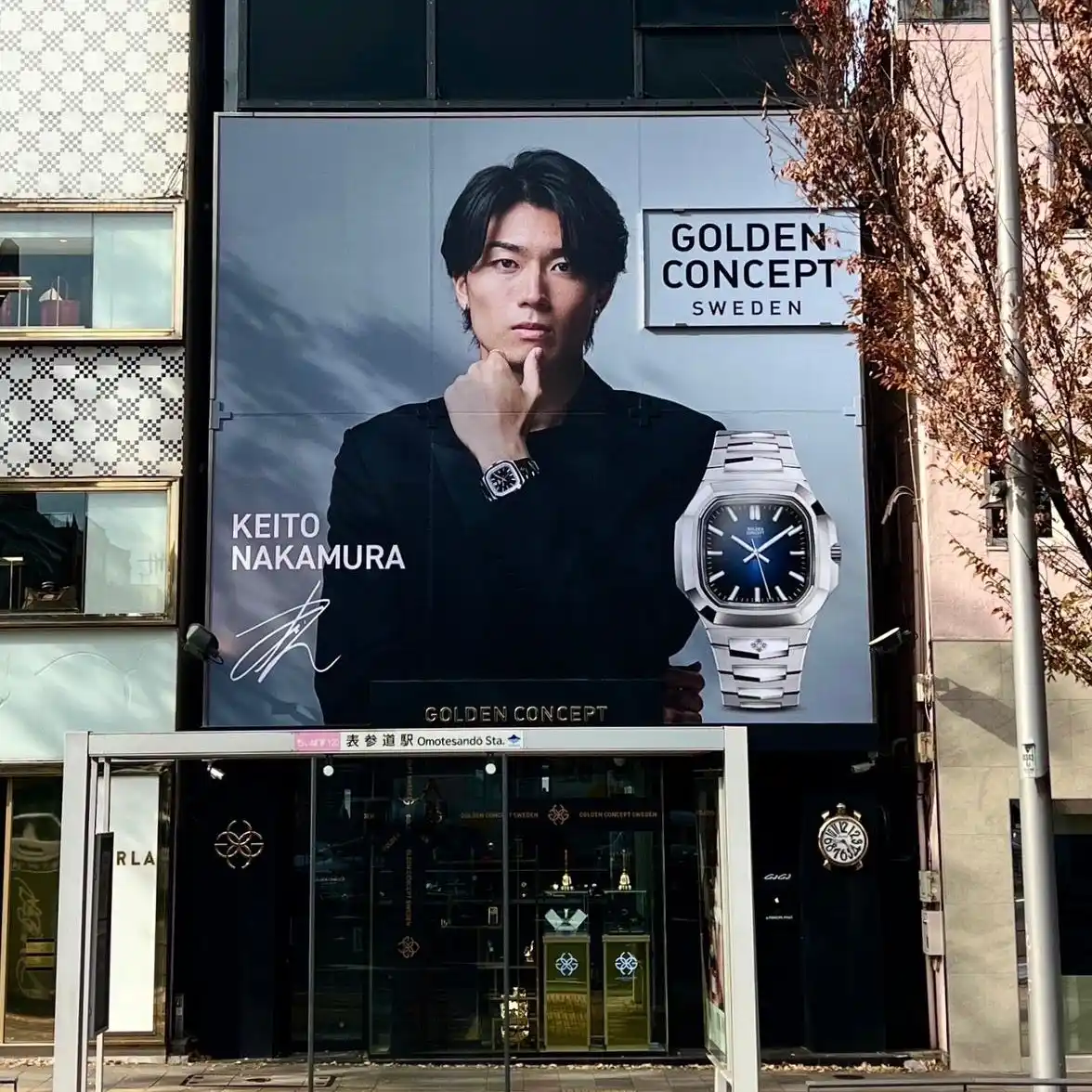 | ゴールデンコンセプト表参道店のビルボードがリニューアル。新ビジュアルでは、新作腕時計「Royal Collection」を着用した中村敬斗選手と、着用モデルを大胆に配したデザインを採用。ブランドの新章を象徴する一本と中村選手の存在感が重なり合うことで、視線を引きつける印象的なビジュアルに仕上がっています。表参道にお立ち寄りの際は、ぜひ新たに掲出されたビルボードをご覧ください。 | ||||||||||||||