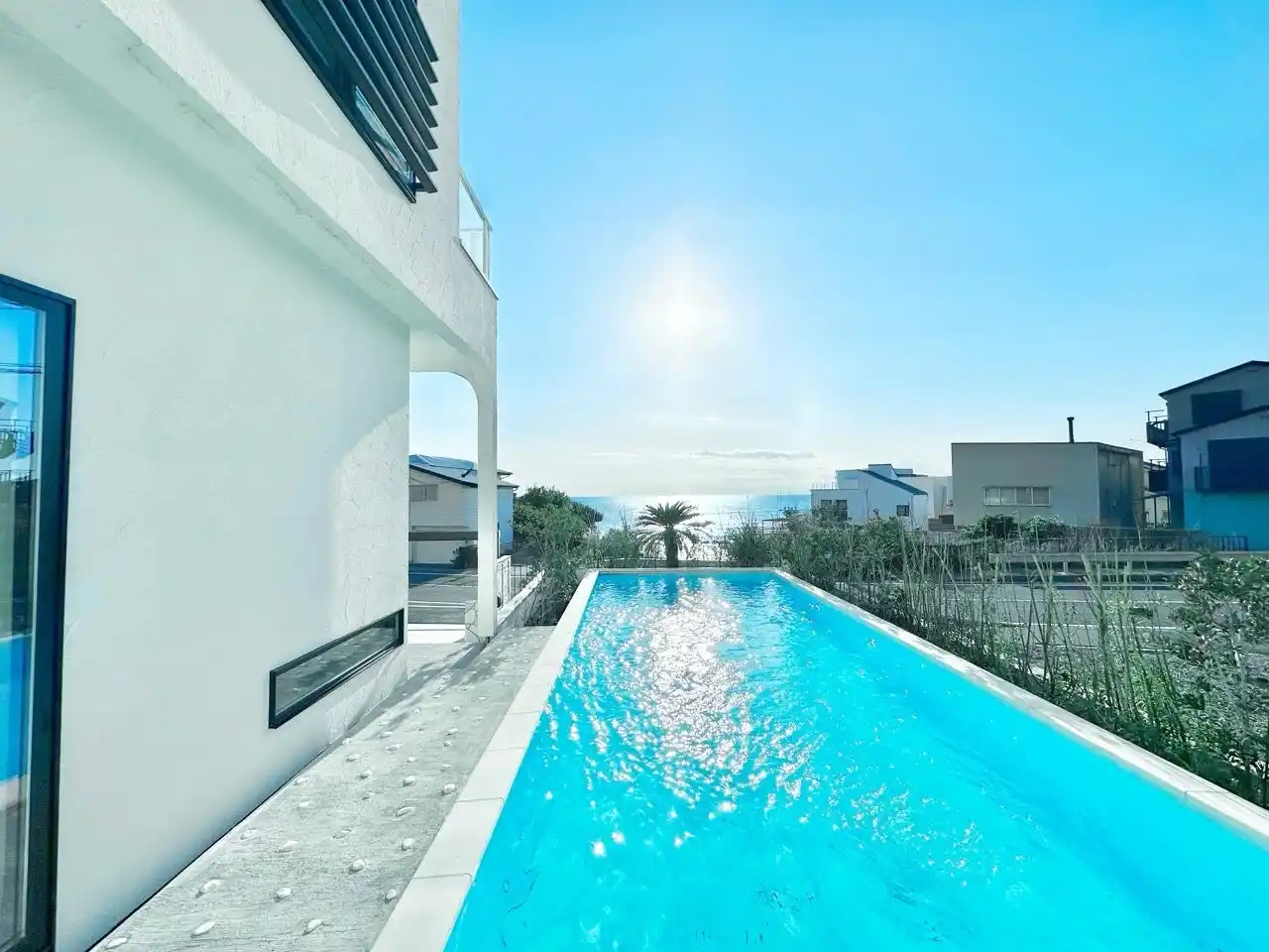吹き抜けと梁見せ天井による開放感あふれる空間に、31.5帖の広々としたLDKを配置。テラスには9m×3.5mのプールを備え、海と空を借景に、家族や友人と特別な時間を楽しめます。 |