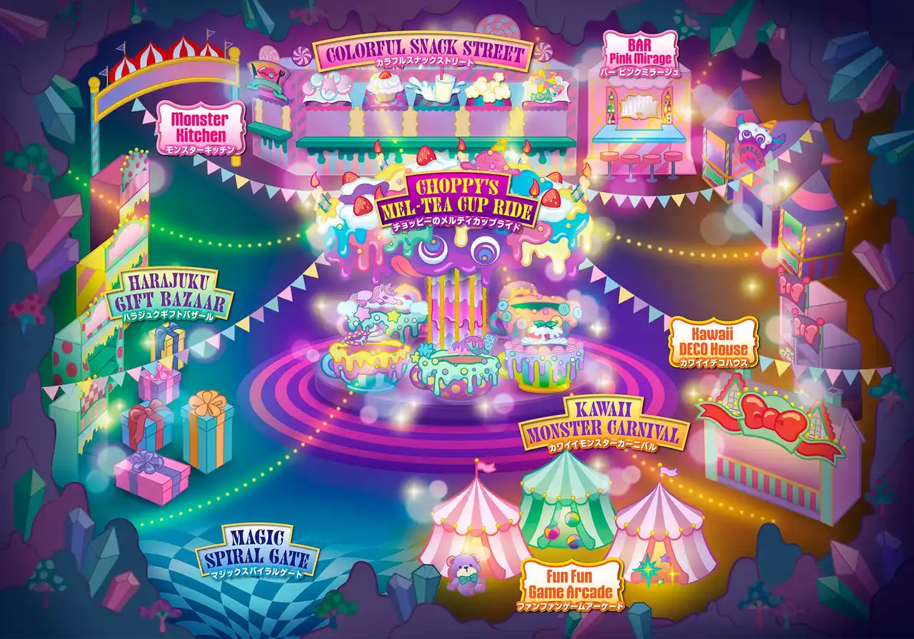 ゲストは、施設のシンボルとなる「Choppy’s Mel-Tea Cup Ride(チョッピーのメルティカップライド)」を中心に、モンスターたちの世界へとつながる「Magic Spiral Gate」、ゲームやデコなどモンスターたちの仲間入りの準備ができる屋台ストリート「Kawaii Monster Carnival」のほか、KAWAIIアイテムや原宿土産を買える「Harajuku Gift Bazaar」、フードやドリンクを楽しめる「Colorful Snack Street」など、地下に広がるワンダーランドを自由に巡り歩くことができます。 |