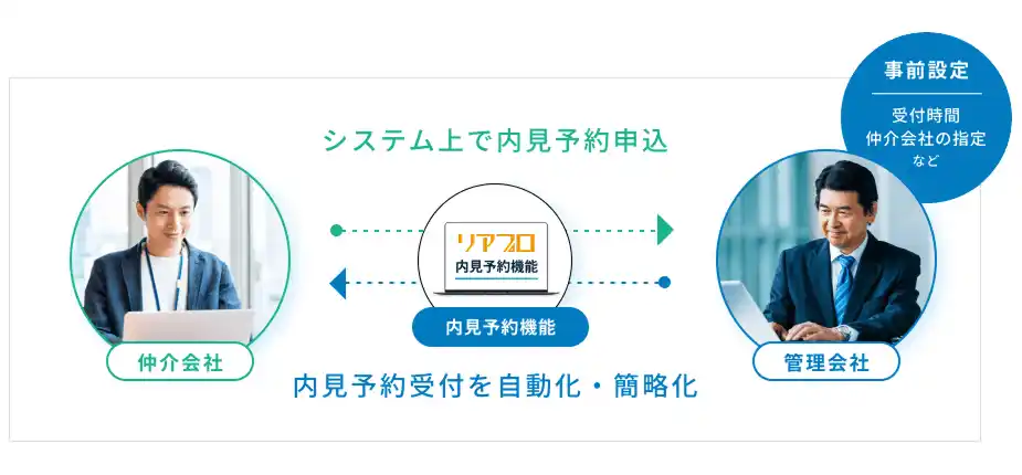 業者間においてこれまでメール、電話、LINEなどでやり取りをしていた内見予約の受付業務を、業者間物件流通サービス リアプロの中で自動または手動で対応するサービスです。受付可能な日時や仲介業者などを予め設定することで自動または手動で判別し、内見予約を受け付けることが可能です。 |