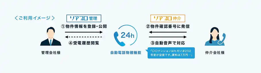 リアプロ掲載物件を利用し、仲介会社からの物件空室情報に関する電話に、自動音声で応答する機能です。これまでは、物件の最新状況を確認するために、管理会社へ電話で問い合わせる必要がありました。本機能の追加により、元付会社は物件空室確認に伴う電話対応の業務時間や対応コストを削減できます。また、仲介会社は時間帯を気にすることなく、24時間いつでも物件確認が可能になります。 |