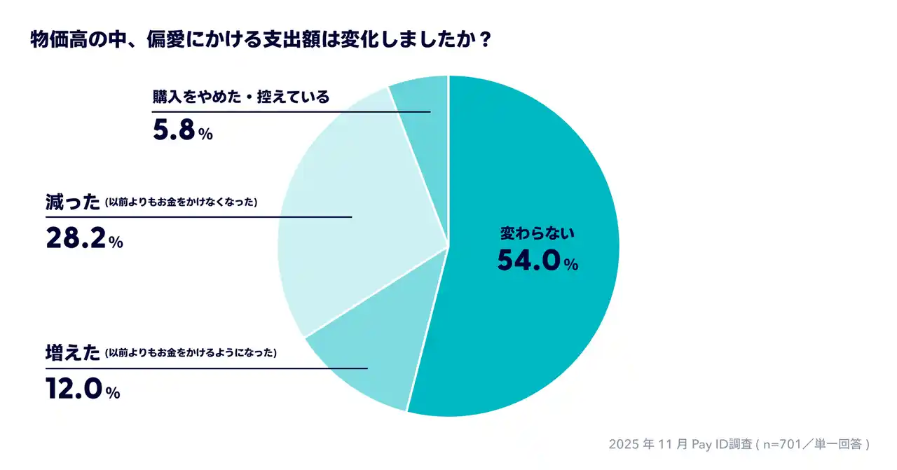 | 物価高で偏愛消費にかけるお金に変化があったかについての設問では「変わらない」が53.9%、「増えた」が12.0%という結果でした。こうした結果から、偏愛消費は一時的な楽しみや気分転換ではなく、物価高という環境下においても支出の優先度が揺らがない、生活の中に根づいた強い愛着の対象になっていることがわかります。 | |||||||||||||||