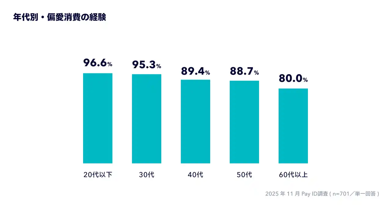 | 年代別に見ると、「20代以下」が96.6%、「30代」が95.3%と9割を超え、「40代」が89.4%、「50代」が88.7%、「60代以上」が80.0%と、調査をした全ての年代で8割以上の方が偏愛消費を経験していることがわかります。 | |||||||||||||||