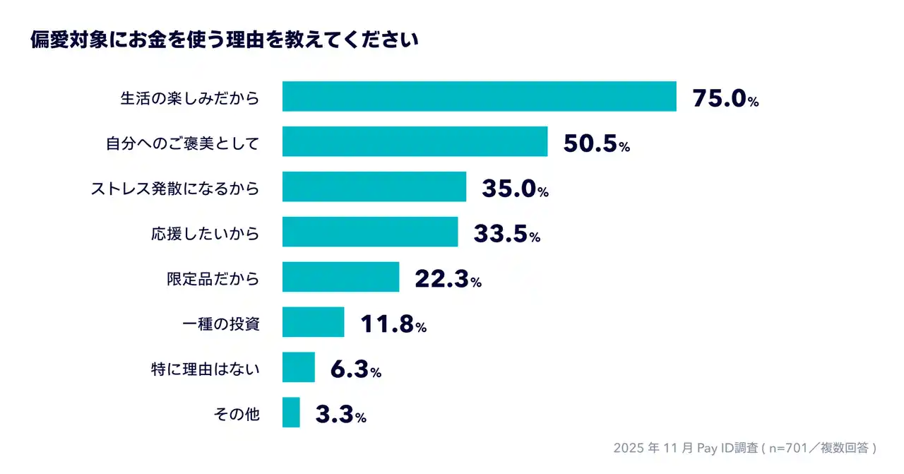 | 偏愛消費に費用をかける理由は、「生活の楽しみだから」が75.0%で最多、次いで「自分へのご褒美」が50.5%、「ストレス発散になるから」が35.0%という結果になりました。こうした結果から、自分の気持ちを満たすことを目的に偏愛消費をするユーザーが多いことが読み取れます。 | |||||||||||||||