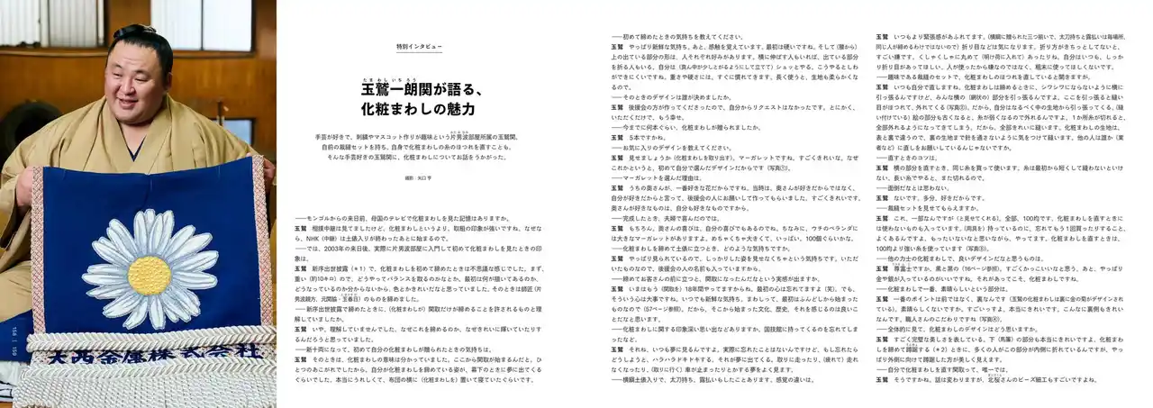 手芸・裁縫が趣味である玉鷲関に、化粧まわしの魅力についてたっぷり語っていただいたインタビュー記事や、化粧まわしの歴史解説、化粧まわしや染め抜き生地の色見本帳を紹介。 |