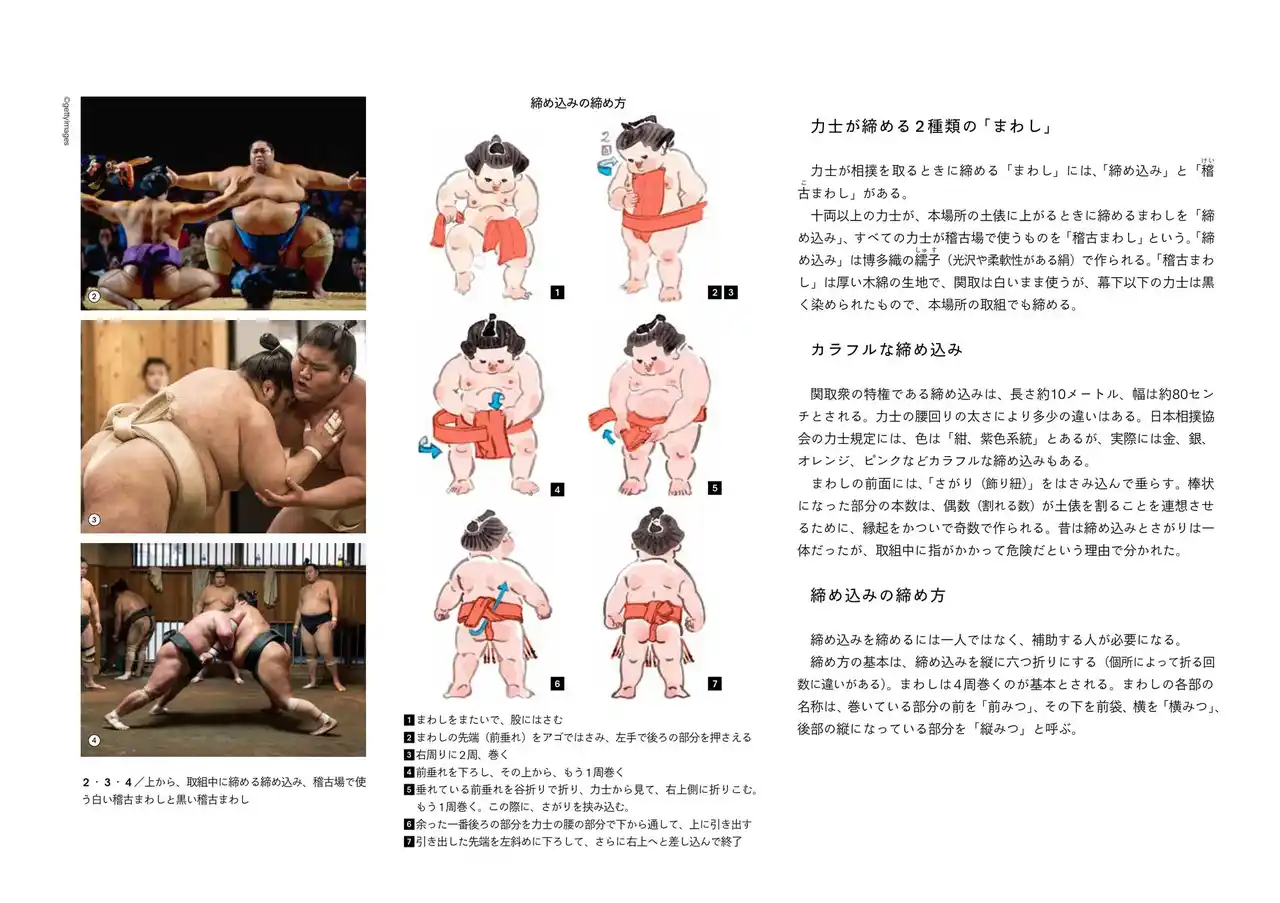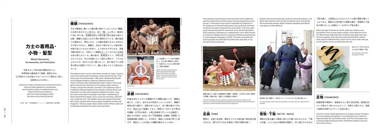 化粧まわしや染め抜き着物以外にも注目したい、相撲界ならではの着用品や小物類、髪型なども解説。相撲にまつわる衣装や装飾について、より知識を深められる情報をたっぷり収録しています。 |