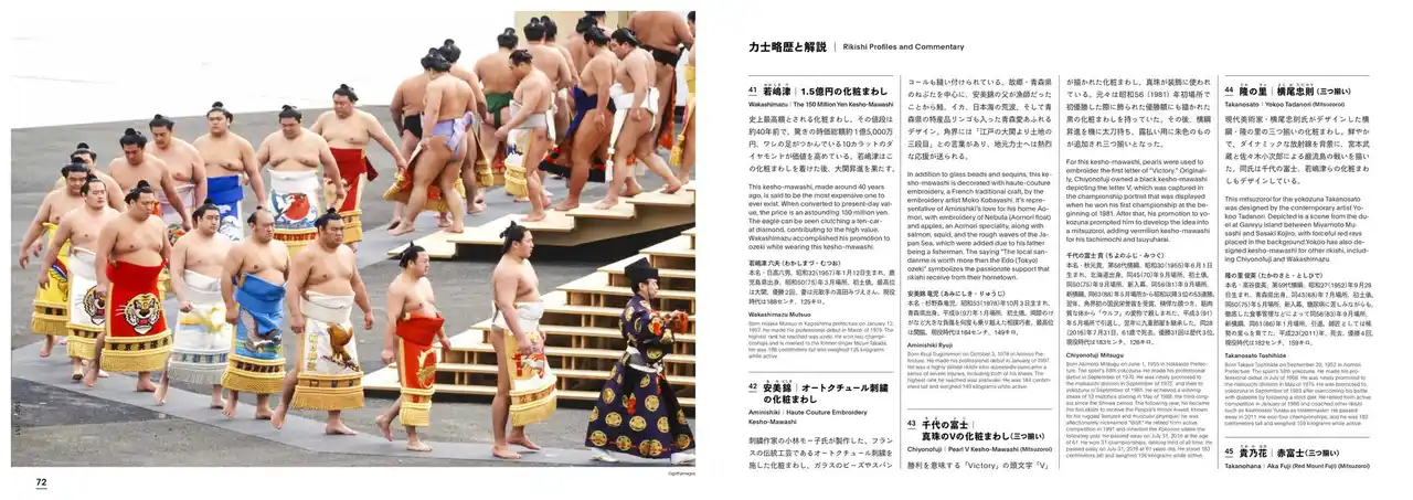 伝統技術を結集させて作られた化粧まわしは、それを力士が締めてこそ輝きを放つ。相撲興行の華とも言える土俵入りや化粧まわしのお披露目会を、写真と解説&力士の略歴とともに振り返る。 |