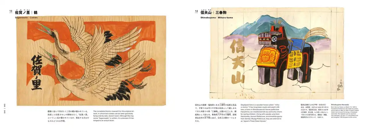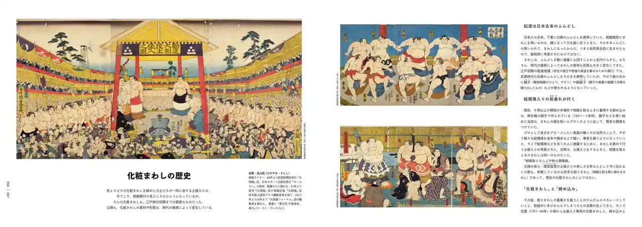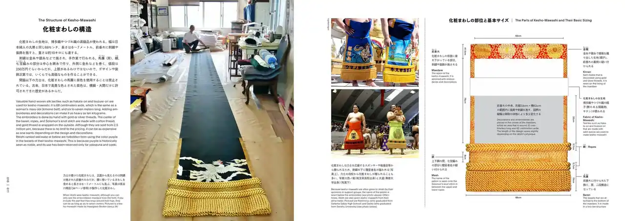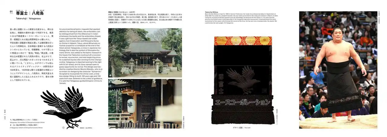 化粧まわしや染め抜き着物のデザインには、参考となった絵や写真、モチーフなどがある。それを化粧まわしや染め抜き着物の規定やサイズに合わせてデザイナーが設計図を描き起こし、その設計図を基にいかにして表現するか、試行錯誤しながら作り上げる。デザイナーや贈呈者、製作者から取材をしてうかがった、様々な化粧まわしや染め抜き着物の製作エピソードを、力士からのオーダー内容やデザイン図案、力士の着姿写真(完成写真)とともに紹介。 |