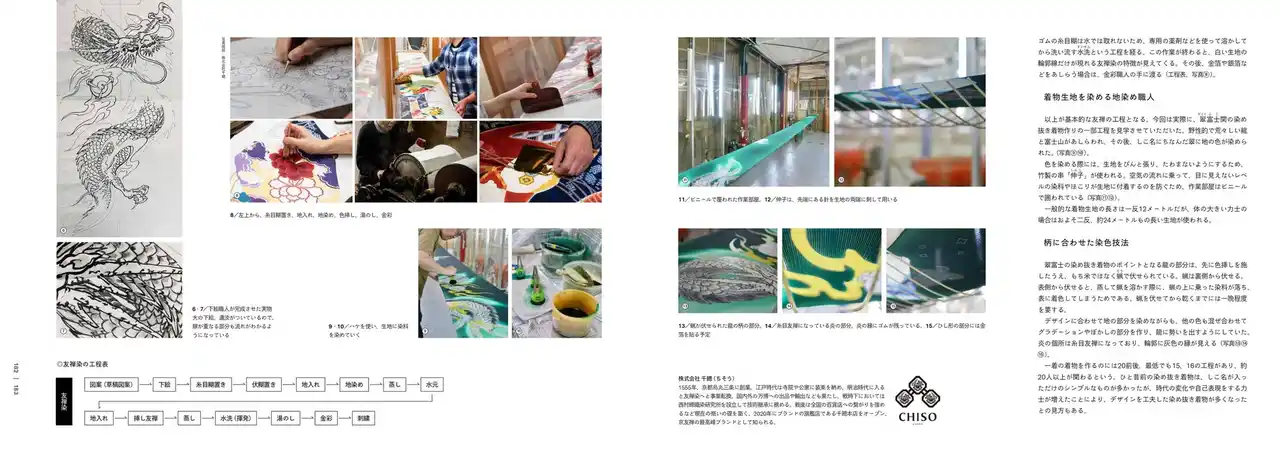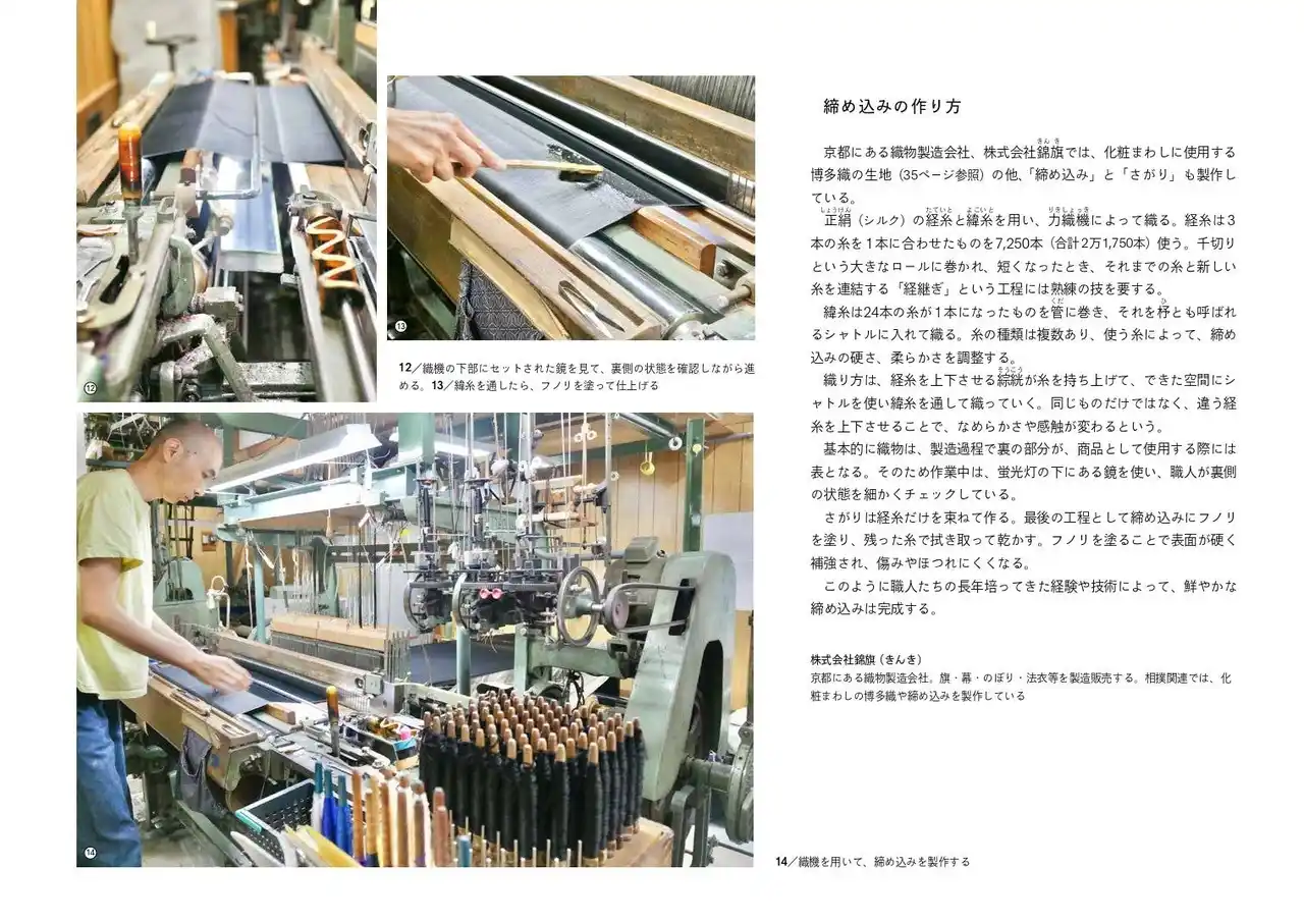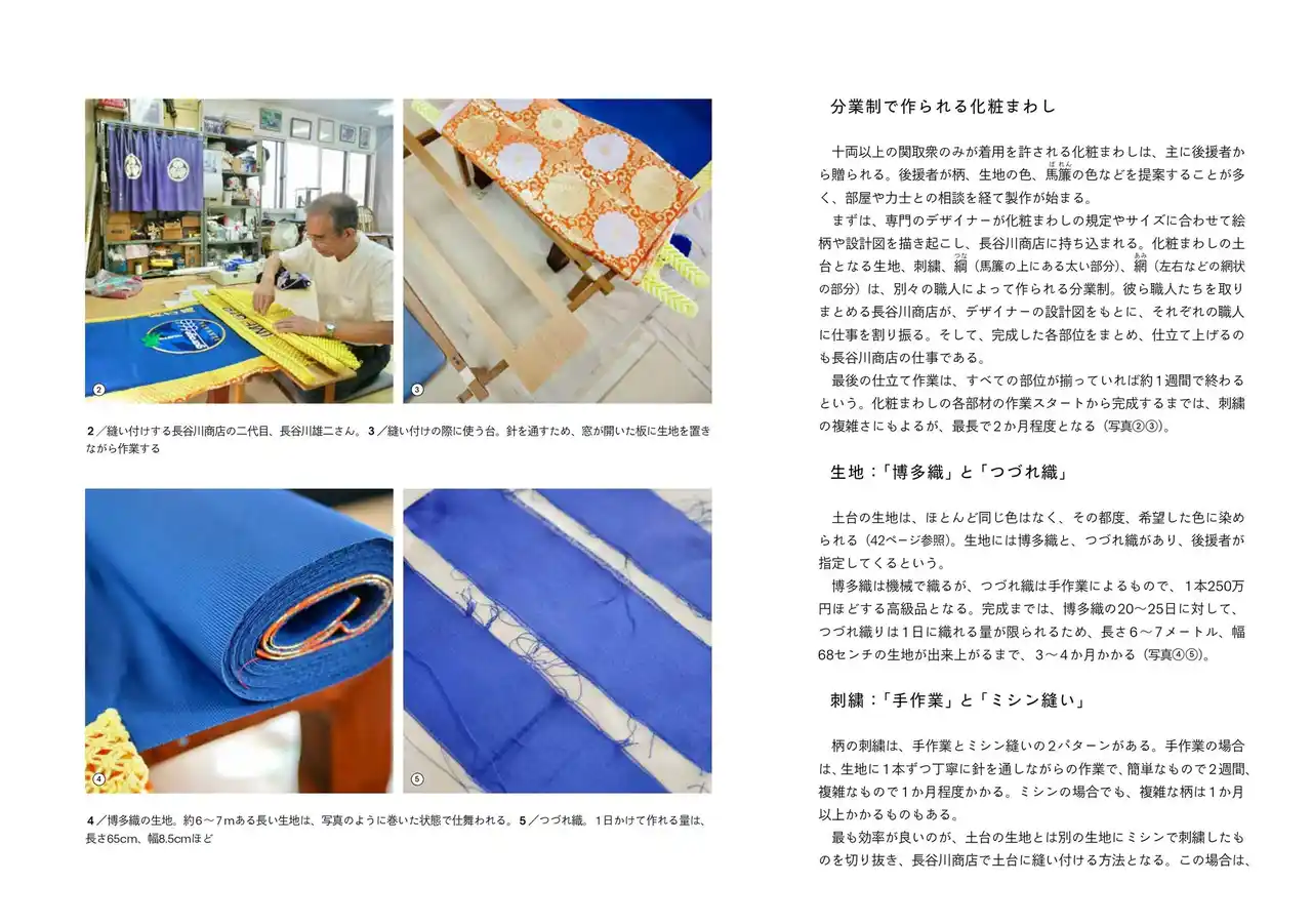 化粧まわしの仕立て職人(長谷川商店)、京友禅の老舗(株式会社千總)、締め込みの織物工房(株式会社錦旗)の製作現場を見学。化粧まわし、染め抜き着物、締め込みが仕上がるまでの過程や技術、職人のこだわりなど、一般には知り得ない製作の舞台裏を、事例とともに紹介する。 |