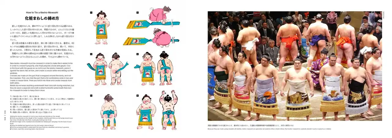 本書では、普段は見ることのできない下絵やデザイン図案、相撲博物館に所蔵されている貴重な化粧まわしや力士の着姿写真などを、すべて解説つきで紹介(日英バイリンガル表記、オールカラー208 頁)。化粧まわしの仕立て職人や着物(京友禅)の老舗、締め込みの織物工房などの製作現場にも取材撮影&収録しています。 |