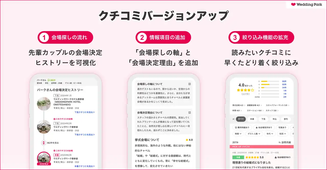 ウエディングパークは創業以来、常にユーザーの課題に向き合い、その解決のためにリニューアルを重ねてきました。これまでリリースされたAIアシスタント「会場比較」「予算マッチ」に続き、今回の「クチコミバージョンアップ」とAIアシスタント「クチコミ要約」も数多くのユーザー調査をもとに生まれた新機能です。 |