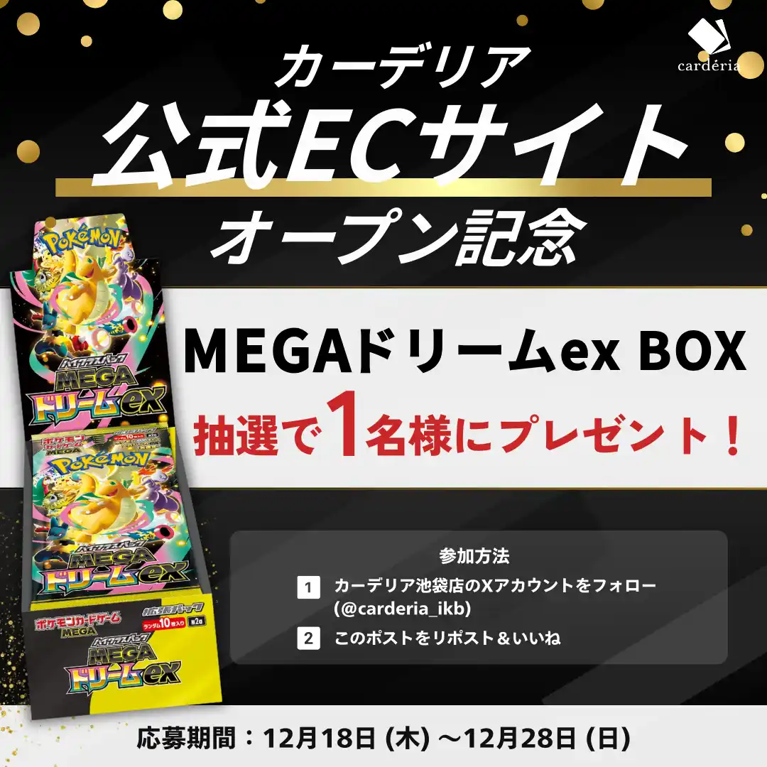 公式ECサイトのオープンを記念し、carderia(カーデリア)池袋店の公式Xアカウントにて抽選で「MEGAドリームex 1BOX」を1名様にプレゼントするキャンペーンを実施いたします。日頃よりcarderia(カーデリア)をご利用いただいている方はもちろん、今回初めてcarderia(カーデリア)を知っていただく方にもお楽しみいただける企画です。 |