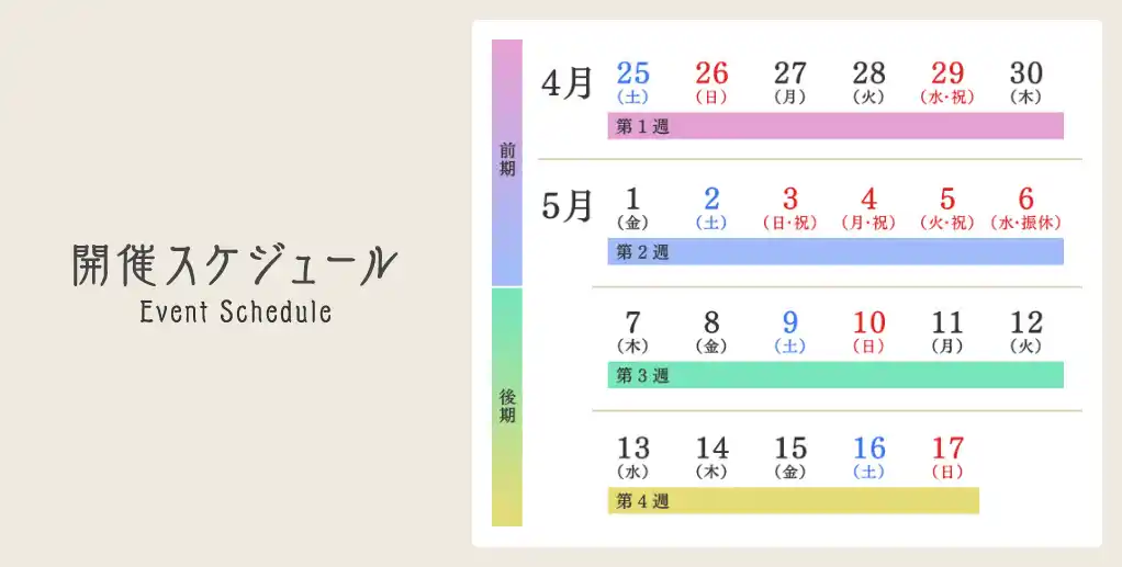 混雑が予想される為、一部日程を「日時指定制/整理番号順入場」とし、 |