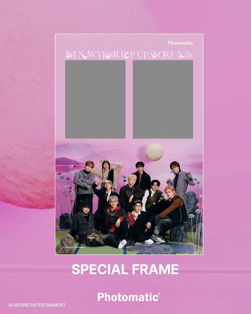 キタムラ・ホールディングス グループのピックハイブ株式会社(本社:東京都新宿区、代表取締役社長 兼 COO:大迫 由典)が運営するセルフフォトブランド「Photomatic(読み:フォトマティック)」は、2026年1月2日(金)からSHIBUYA109で開催される大人気ボーイズグループ「INI」のポップアップストア『INI NEW YEAR POP-UP STORE 2026』の東京会場・大阪会場・愛知会場にて、本イベント限定のコラボレーションフレームで撮影できるセルフフォトブースを設置いたします。 |