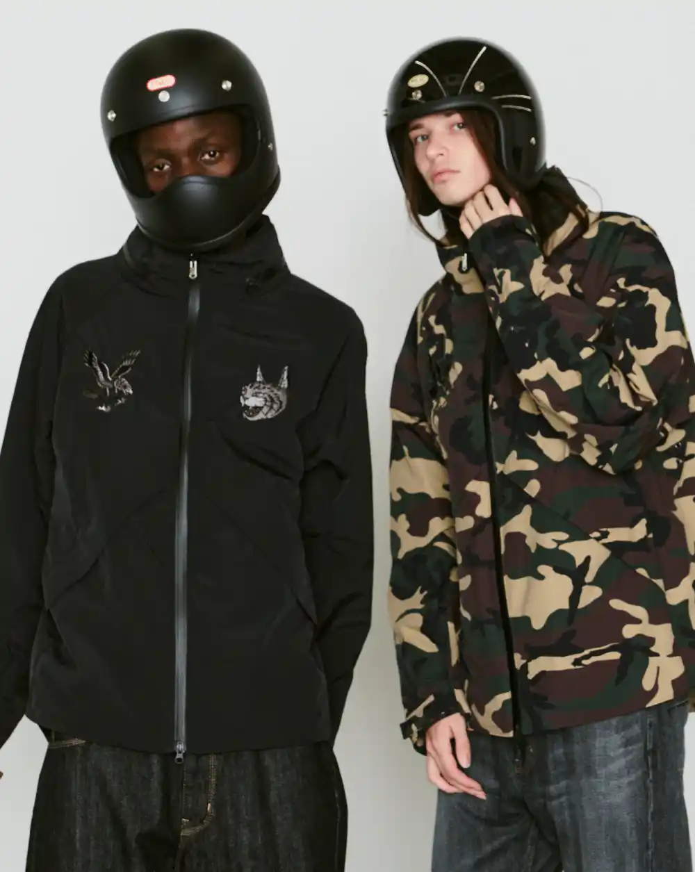 今回のアイテムでは、アウトドアウェアにスーベニアジャケットのテイストを取り入れ、胸元には両ブランドを象徴するモチーフを刺繍で表現。 左胸には、WILD THINGS のアイコンであり冒険心を象徴する WILD CAT、右胸には、roarguns の世界観にたびたび登場する“強さ”と“勇気”のシンボル EAGLE を向かい合わせに配置した。 |