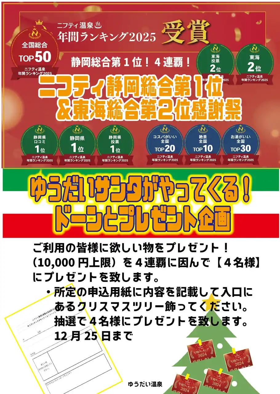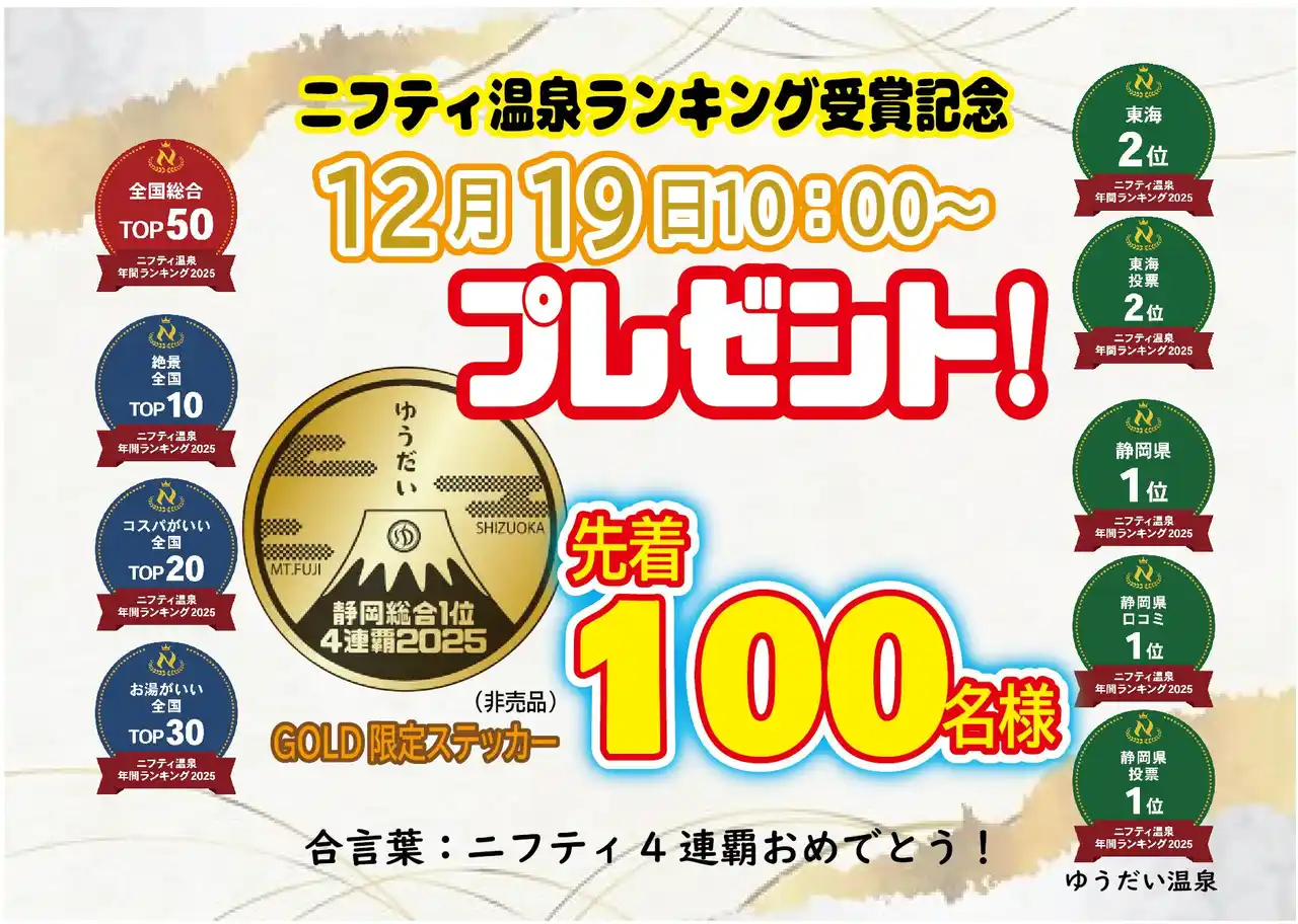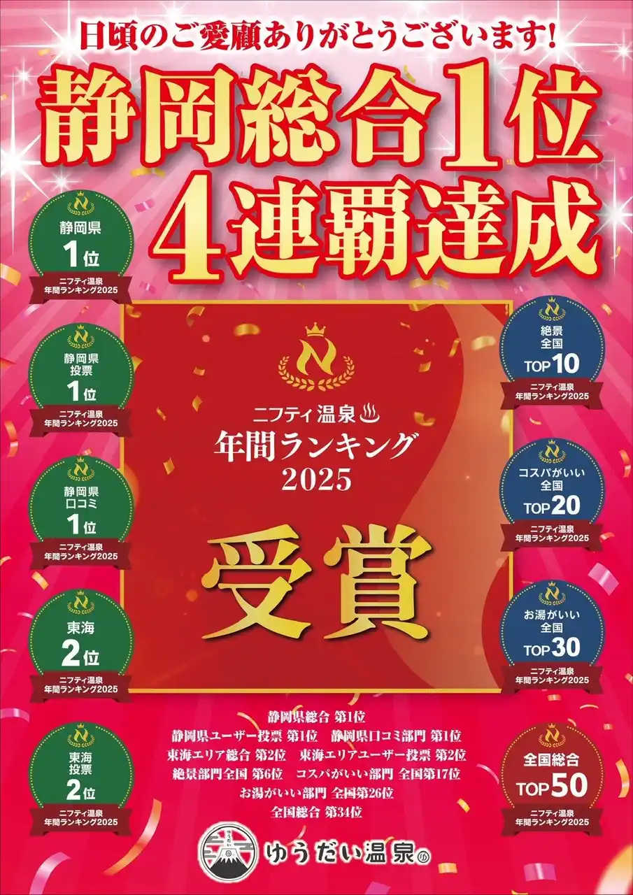 三島市の「日帰り天然温泉 ゆうだい温泉」(運営:ゆうだい温泉株式会社/所在地:静岡県三島市徳倉1195/代表取締役:塚原節男)は、「ニフティ温泉 年間ランキング2025」において静岡県総合第1位を4年連続で受賞、あわせて東海エリア総合第2位を獲得しました。 さらに全国総合TOP50をはじめ、計9部門での受賞となりました。 |
