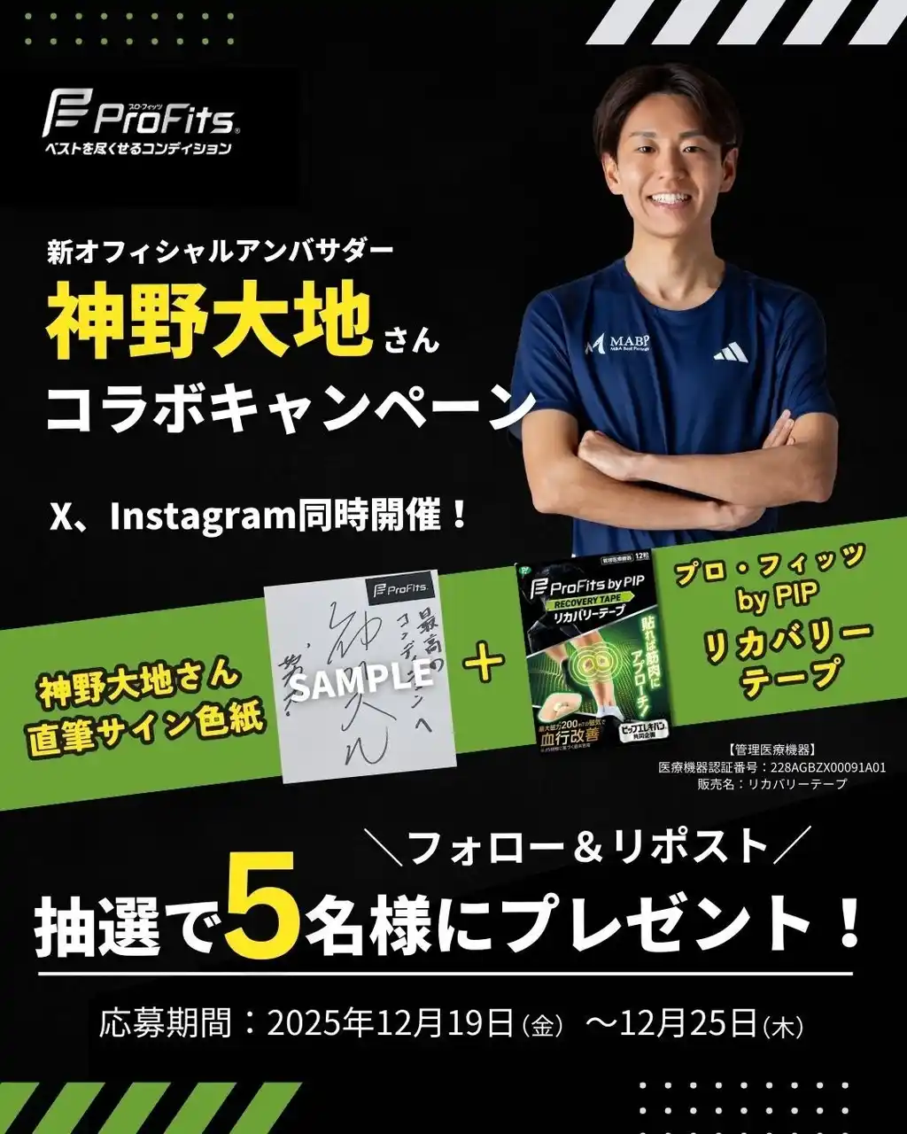 | 神野大地さんのオフィシャルアンバサダー就任を記念して、神野さんの「直筆サイン色紙」と、「プロ・フィッツ by PIP リカバリーテープ」がセットで当たるキャンペーンを、12月19日(金)19:00~25日(木)23:59に実施します。下記の方法でご応募いただいた方の中から抽選で5名様に賞品をプレゼントします。 | |||||||||||||||||||