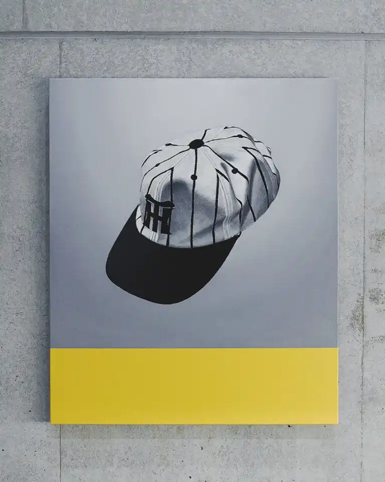 | 亀井氏が、阪神タイガースの往年のストライプ柄オールドキャップをモチーフに描き上げた作品を使用した特別アイテムが完成。 | |||||||||||||||