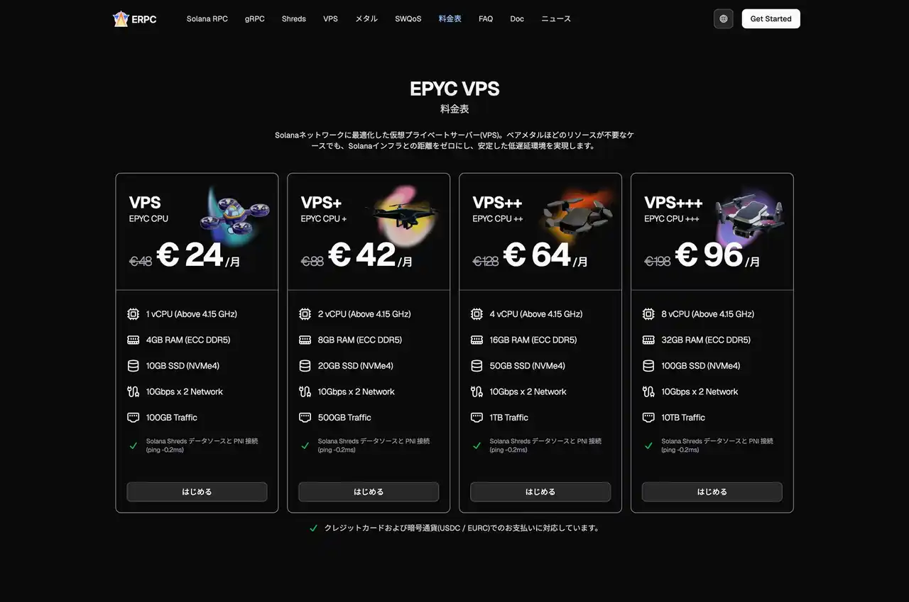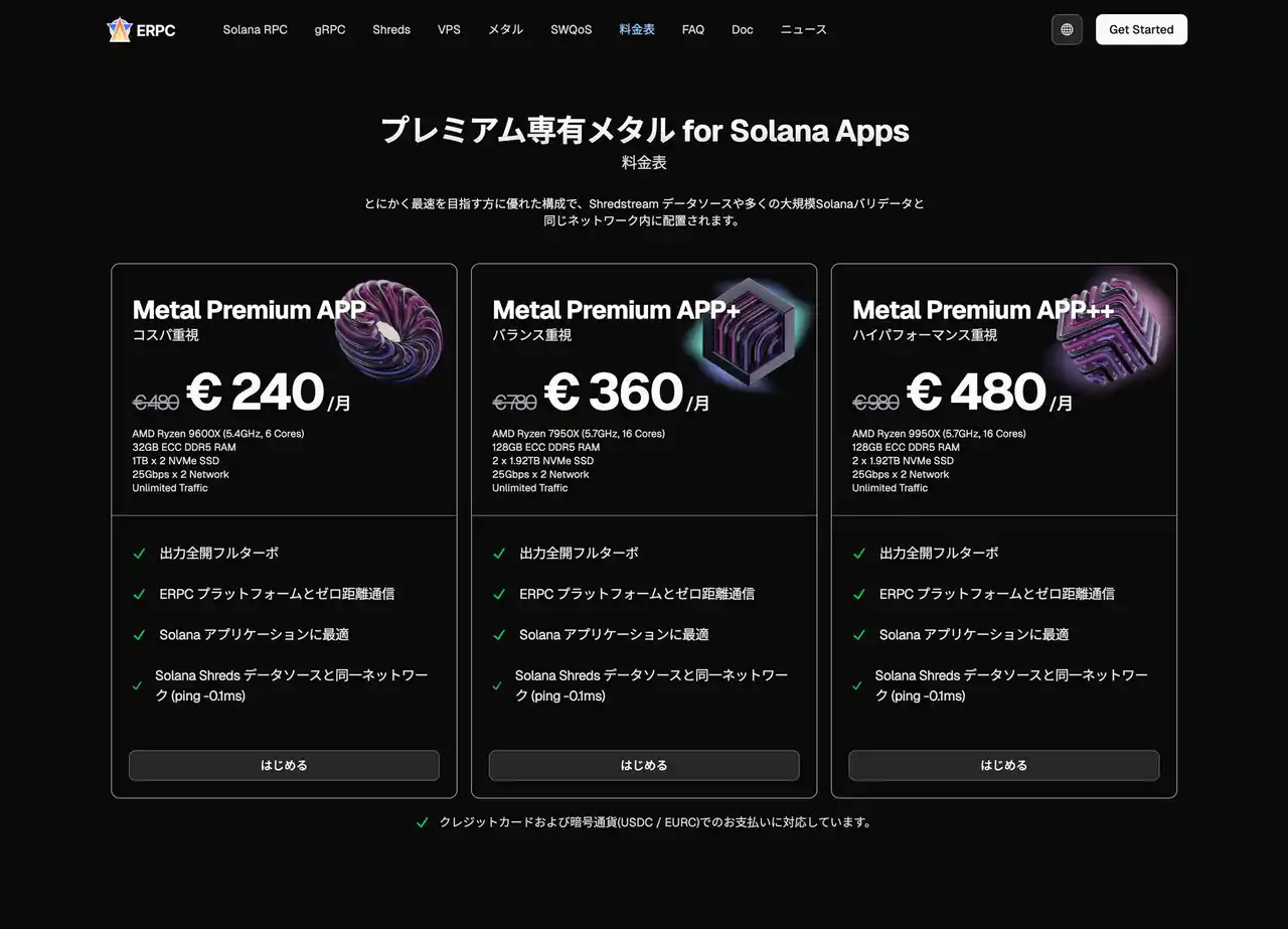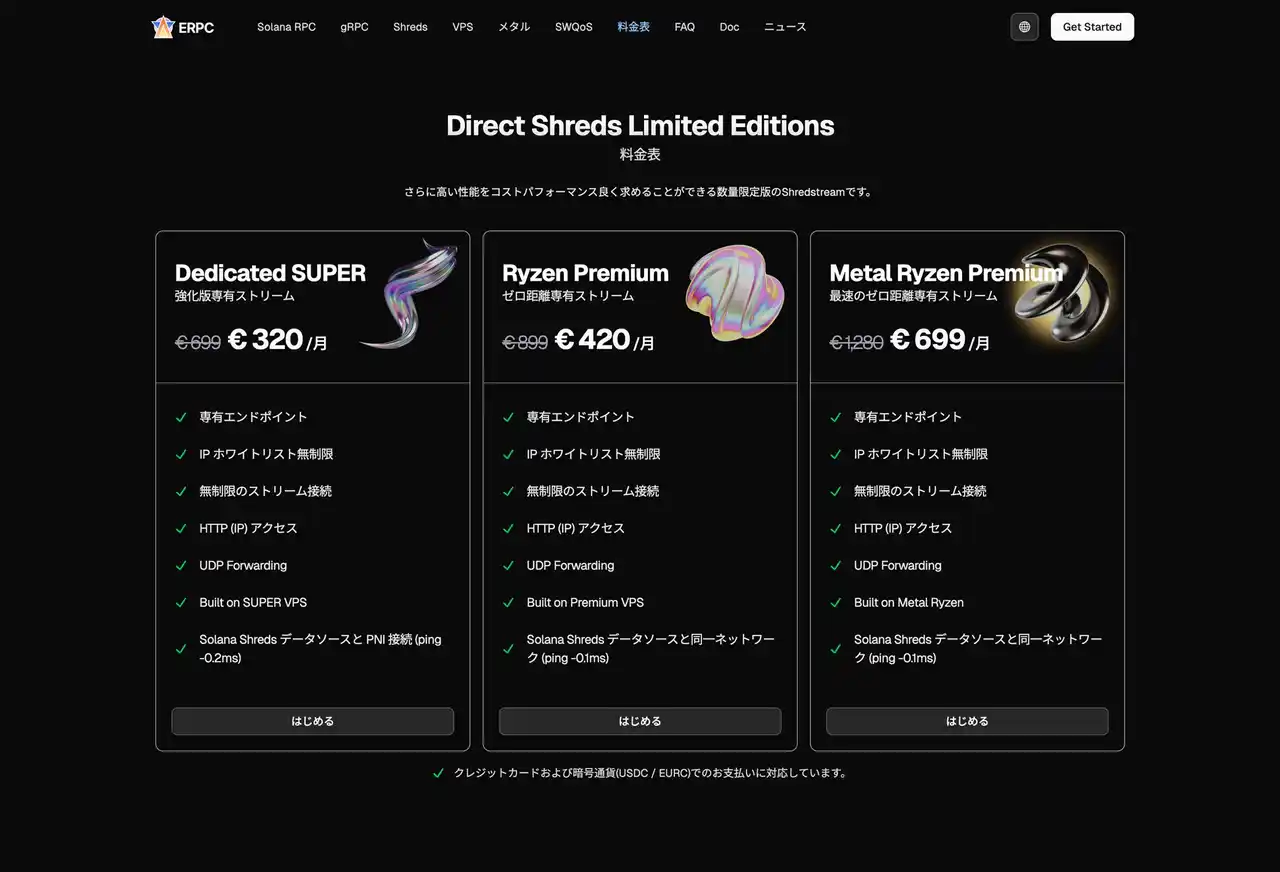 ERPC の東京リージョンは、RPC、Geyser gRPC、Shredstream、Dedicated Shreds を同一データセンターおよび近傍ネットワーク内に配置し、取得・処理・送信の各レイヤーを分断しない構成を前提としています。 |