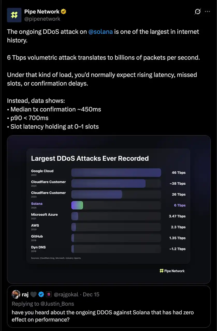 注目度の上昇は、そのままネットワーク負荷の増大につながります。Pipe Network は、Solana が過去1週間にわたり継続的な DDoS 攻撃を受け、ピーク時には約 6Tbps 規模に達したと指摘しました。これは、4K 動画換算で同時に約24万本分に相当する通信量です。 |