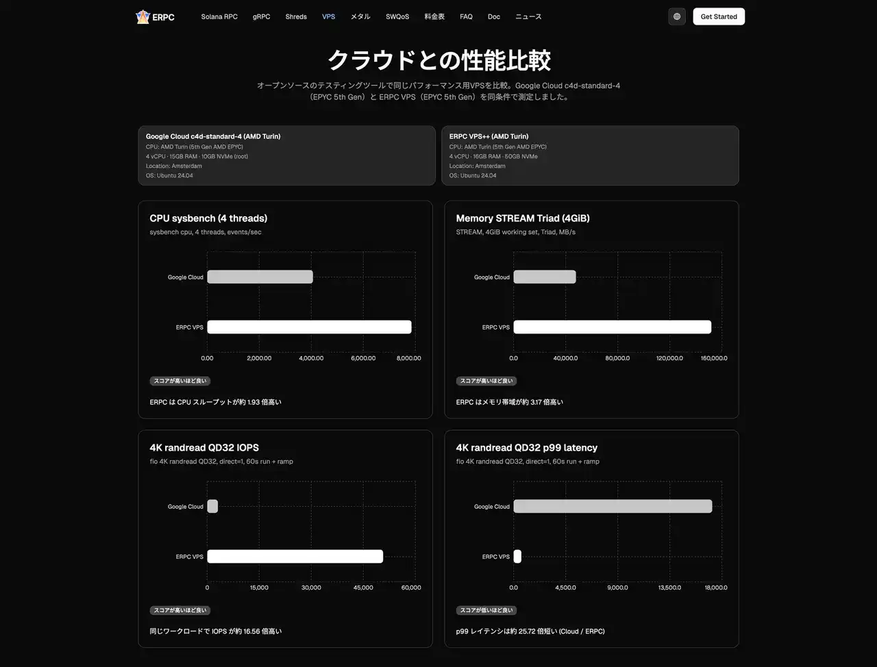 ERPC の Premium VPS は、多用途向けクラウド環境とは異なり、CPU のオーバーコミットを行わず、最新世代 CPU を高クロックで安定動作させる前提で構成されています。加えて、ストレージ I/O やネットワーク経路に余計な仮想レイヤーを挟まない設計とすることで、レイテンシの平均値だけでなく、p99 を含む遅延の揺らぎを抑えています。 |