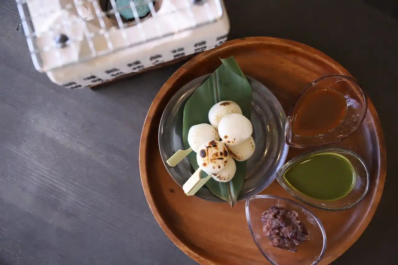 | 小さな七輪で自分好みにお団子を炙り、香ばしく焼き上げた出来たてを、あんこ・抹茶・みたらしの3種で味変しながら楽しめます。 | |||||||||||||||