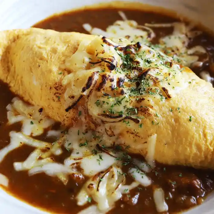 | ふわふわに仕上げた卵のオムレツの上に、こんがりと焼き上げたチーズをたっぷりとのせ、コク深いカレーと合わせた一皿です。 | |||||||||||||||