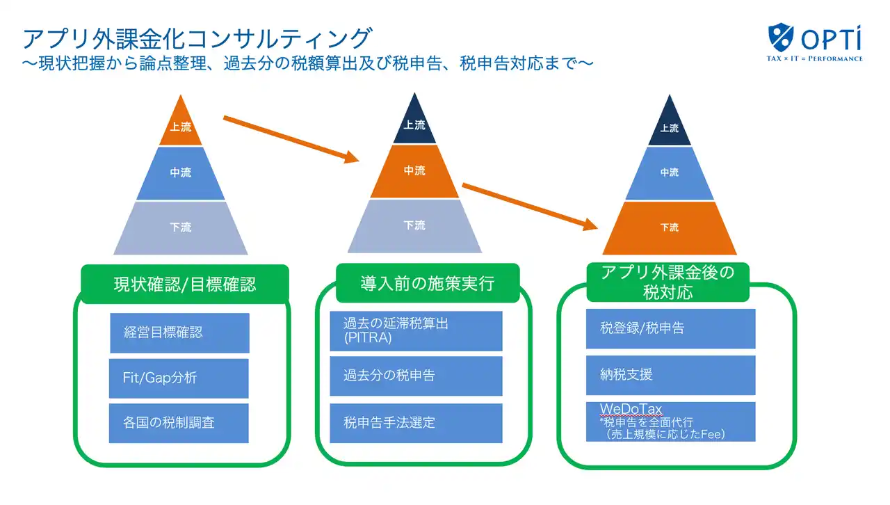 | オプティでは、これまでゲーム業界・アプリ業界を中心に、世界各国での税務対応を支援してきました。また、PIVOTにも出演し、Tax Technologyの導入支援も数多く取り扱ってきた実務経験を踏まえ、アプリ外課金化に向けたコンサルティングを、以下の三つのフェーズに分けて提供しています。 | |||