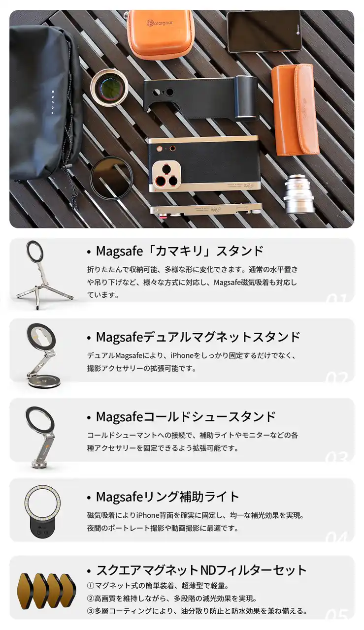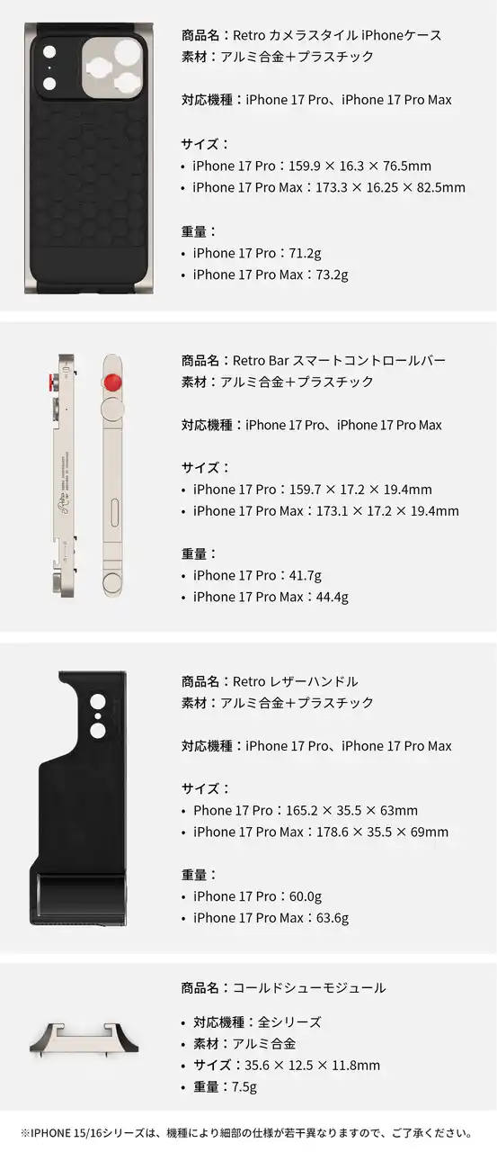 モバイル撮影機材の革新を続ける「Fotorgear」は、iPhoneをクラシックカメラのような操作感と外観へと変貌させる撮影システム「Fotorgear Retro DMF」の最新ラインナップを発表いたします。 既存のiPhone 15/16 Proシリーズに加え、次期「iPhone 17 Pro / Pro Max」対応モデルを新たに追加。さらに、プロ仕様の「75mmマクロレンズ」と「2X望遠レンズ」も同時リリースいたします。 |