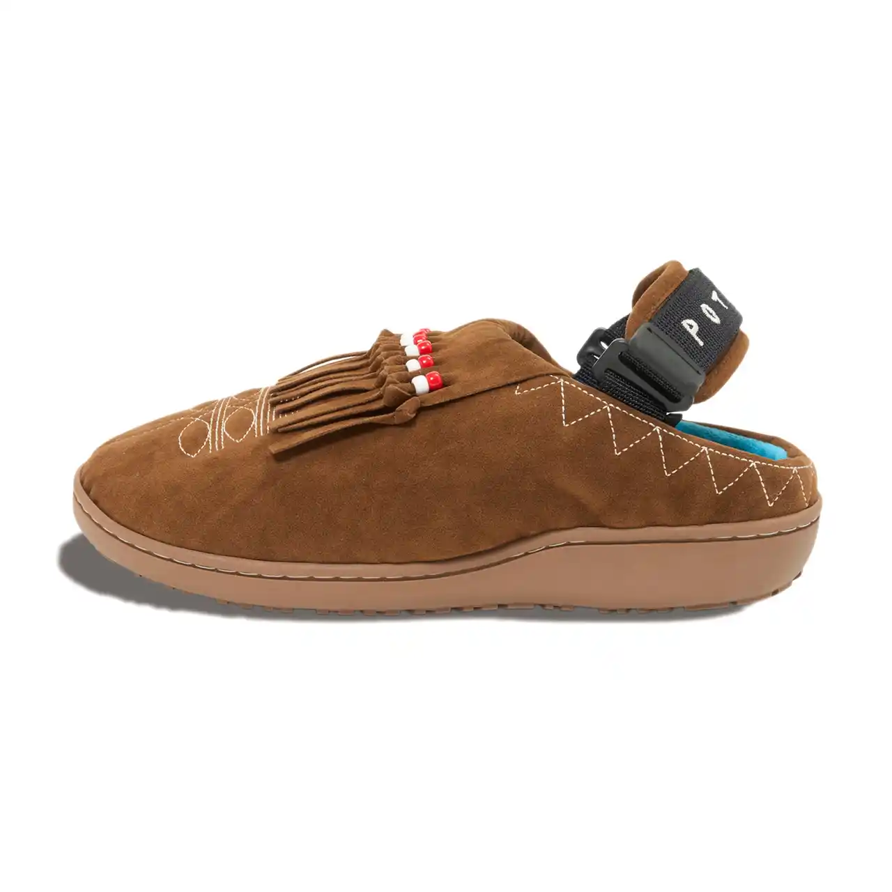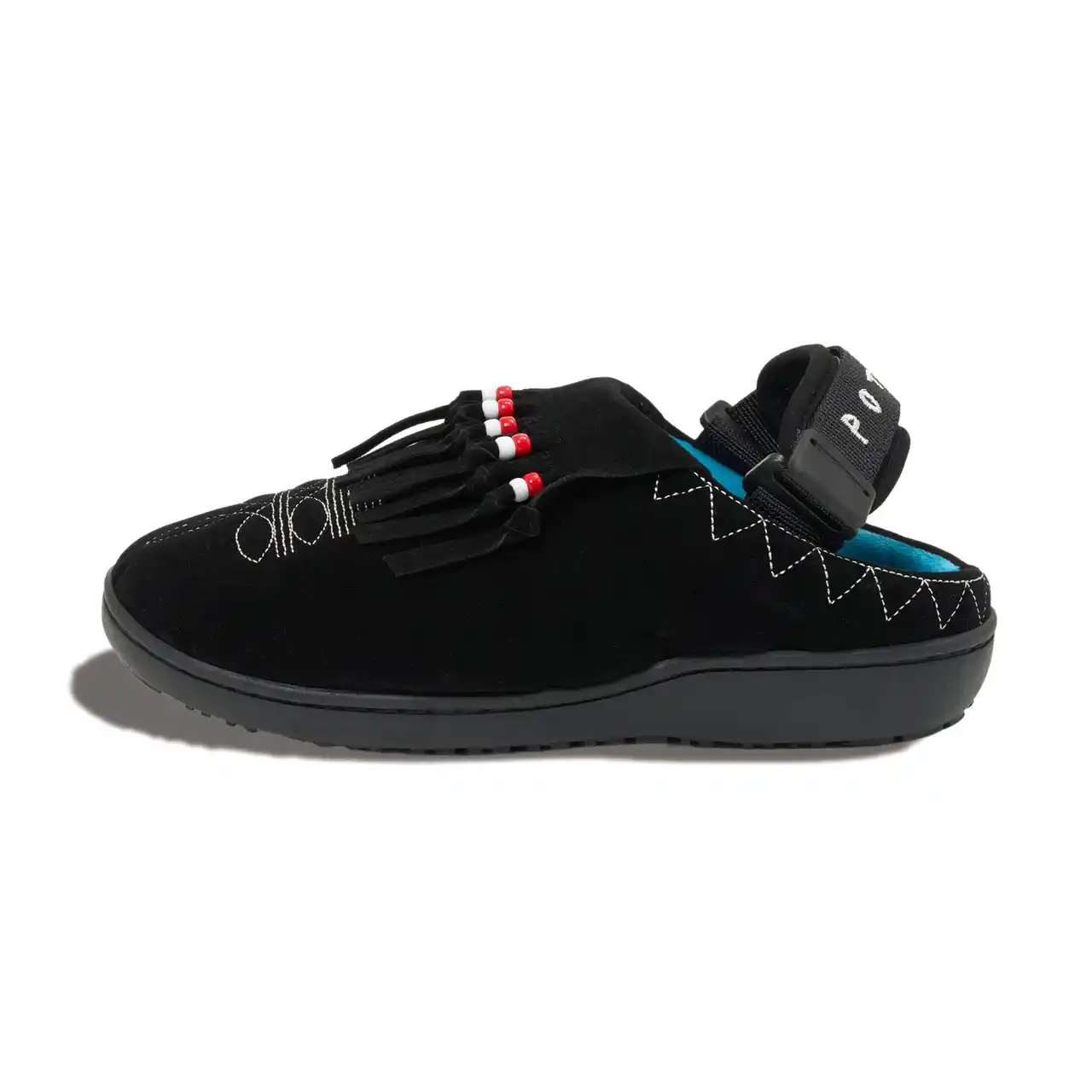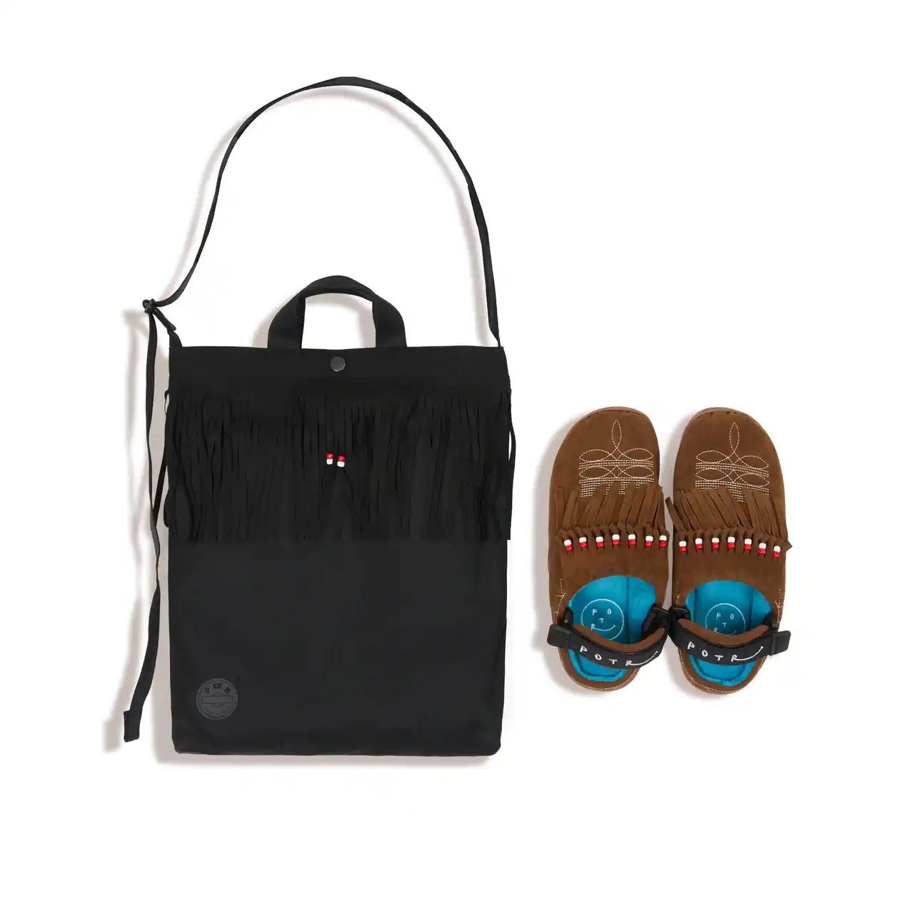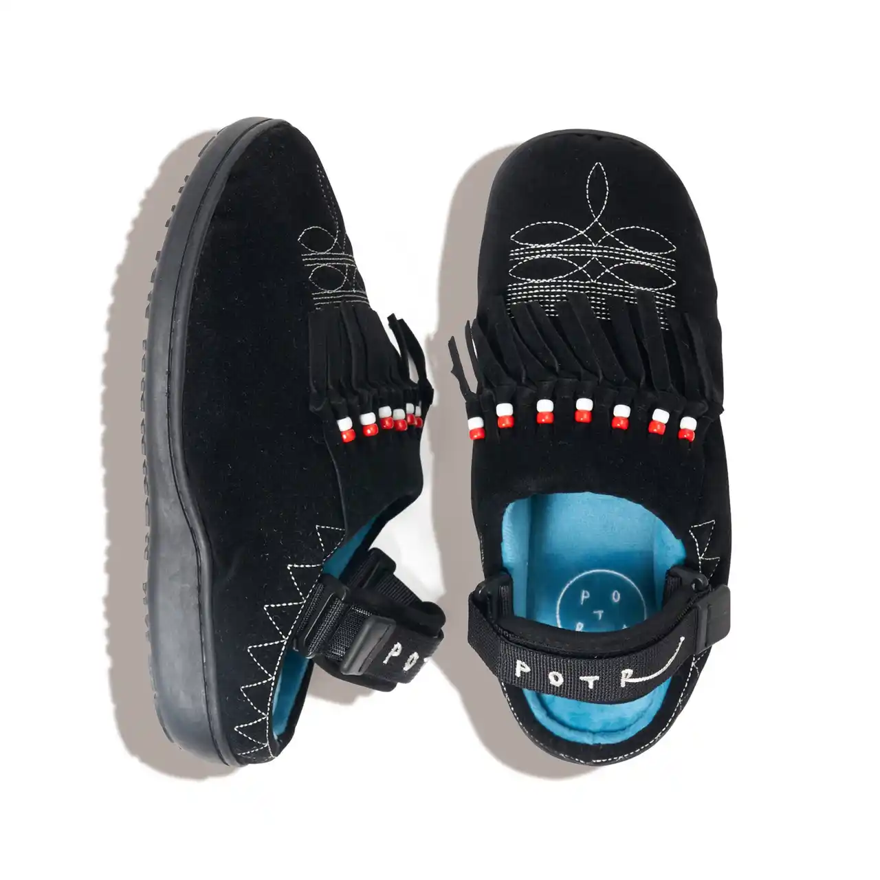 | ネイティブアメリカンならではのフリンジや刺繍、ビーズを施し、フットベッドにはPOTRを象徴するターコイズブルーを採用しました。 | |||||||||||||||||||