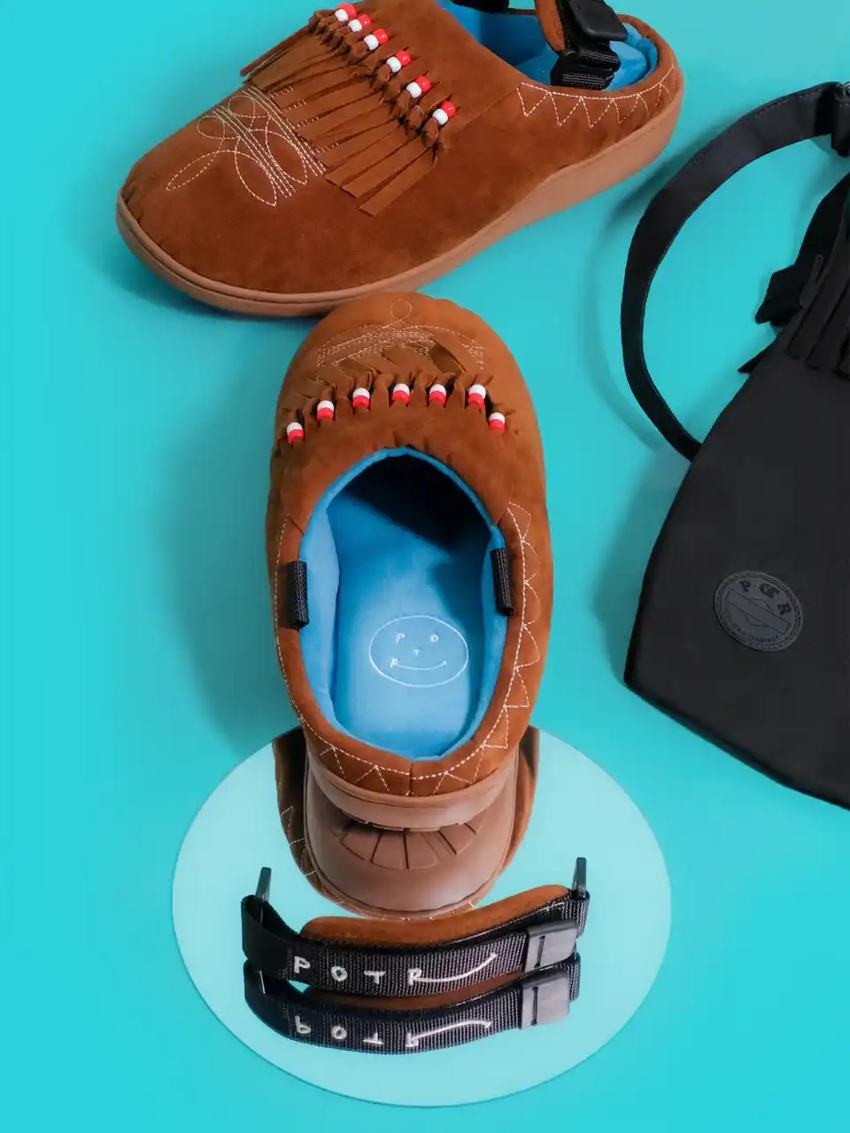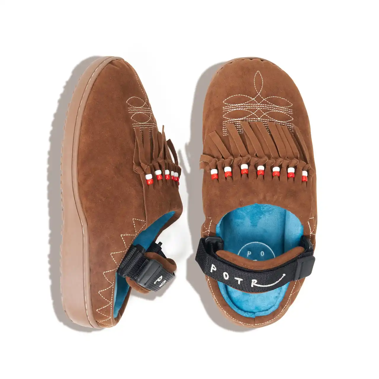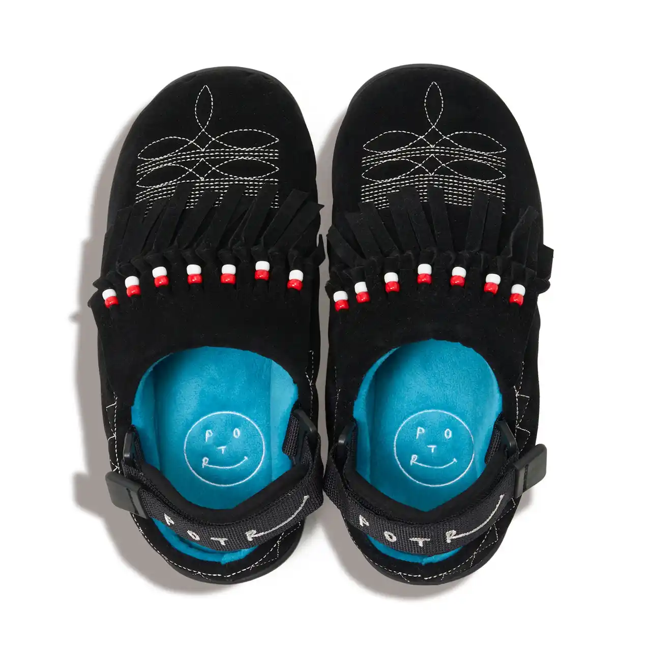 | ネイティブアメリカンならではのフリンジや刺繍、ビーズを施し、フットベッドにはPOTRを象徴するターコイズブルーを採用しました。 | |||||||||||||||||||