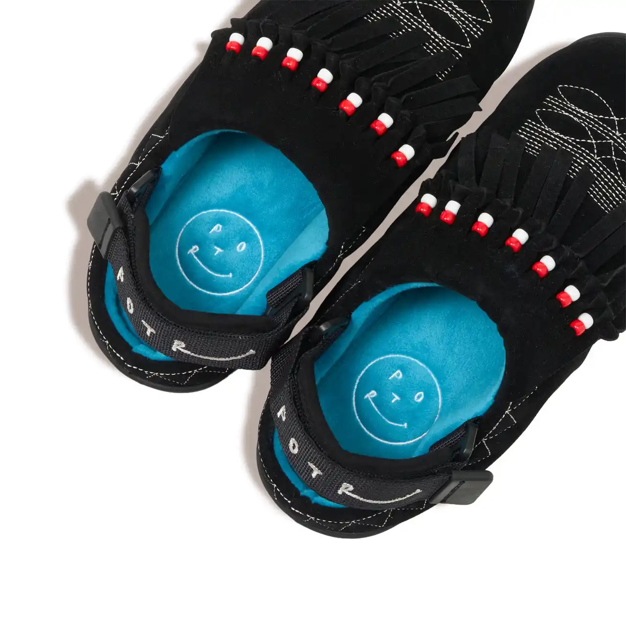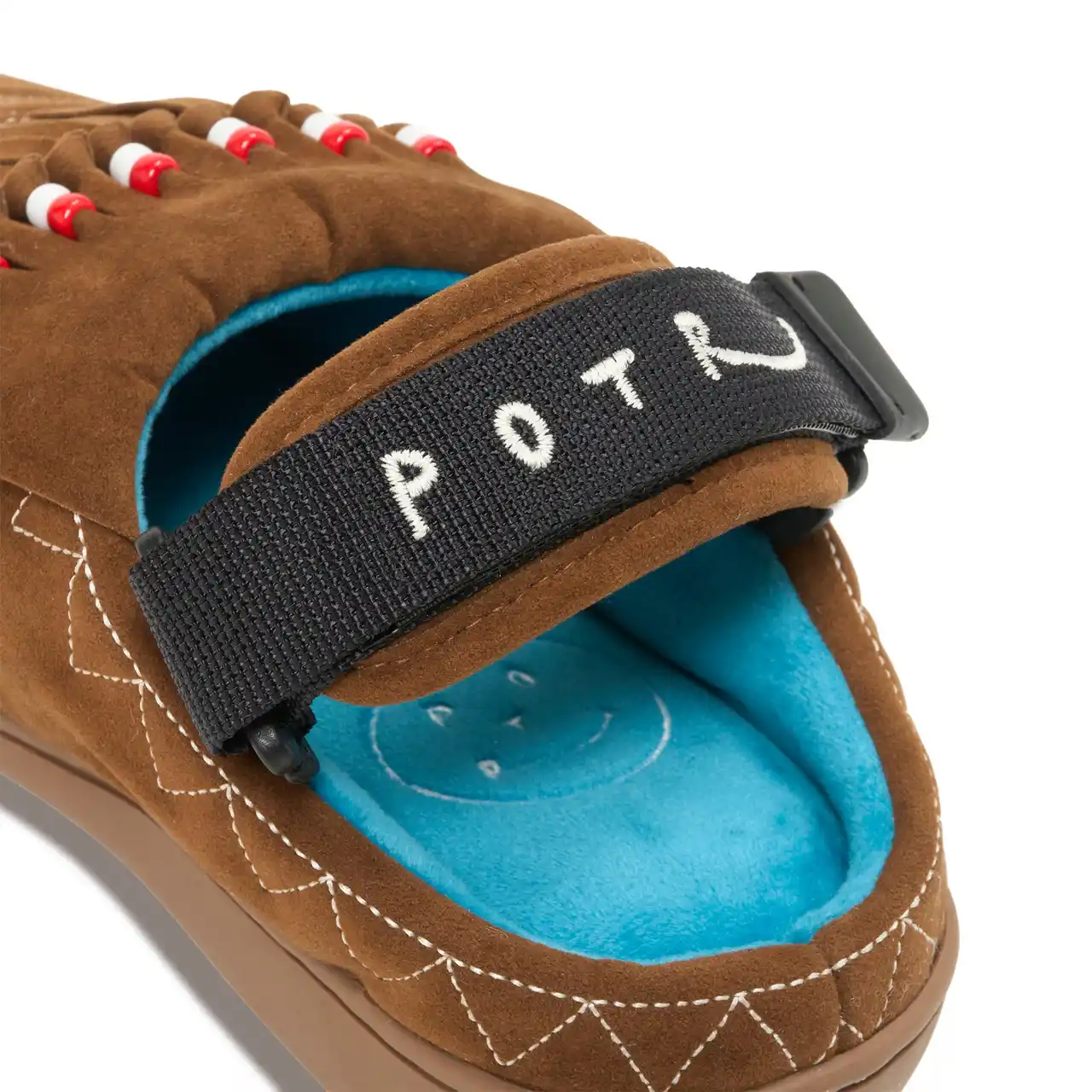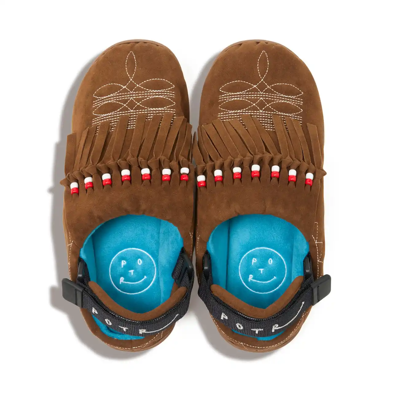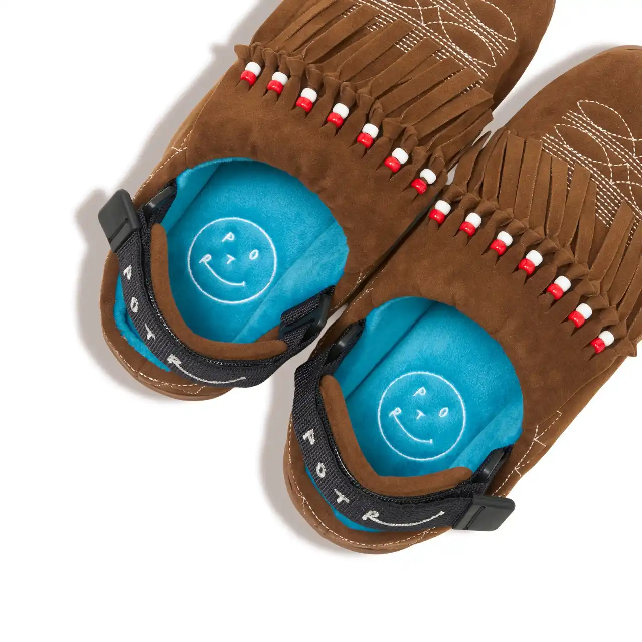| ネイティブアメリカンならではのフリンジや刺繍、ビーズを施し、フットベッドにはPOTRを象徴するターコイズブルーを採用しました。 | |||||||||||||||||||