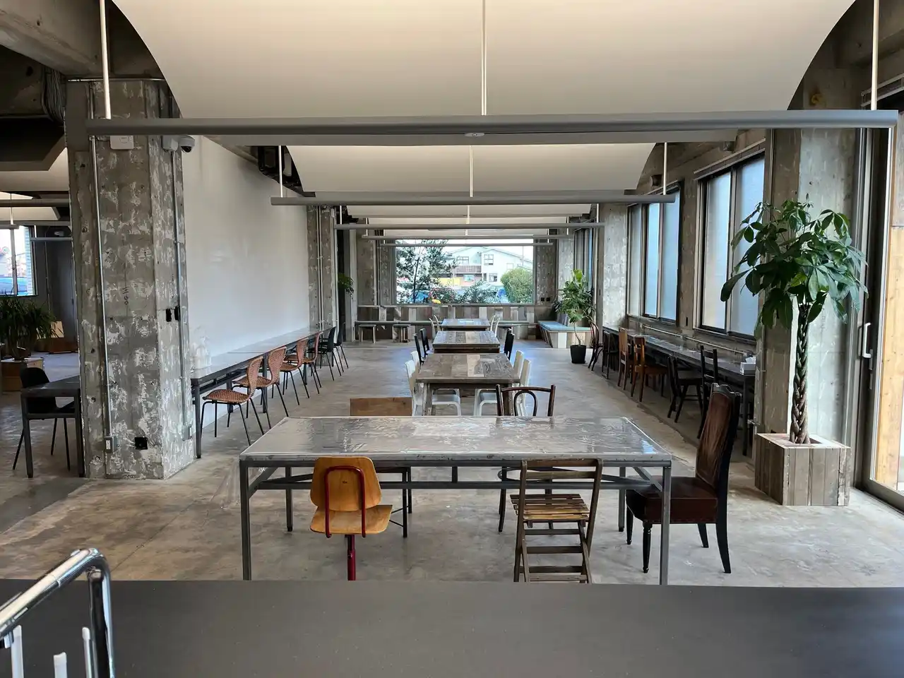 広々した店内には、造船所の現場で実際に使われていた「足場板」を再利用したインテリアや、船の骨組みをイメージした照明、船舶設計図の展示など、造船のまちならではの意匠を施しています。 |