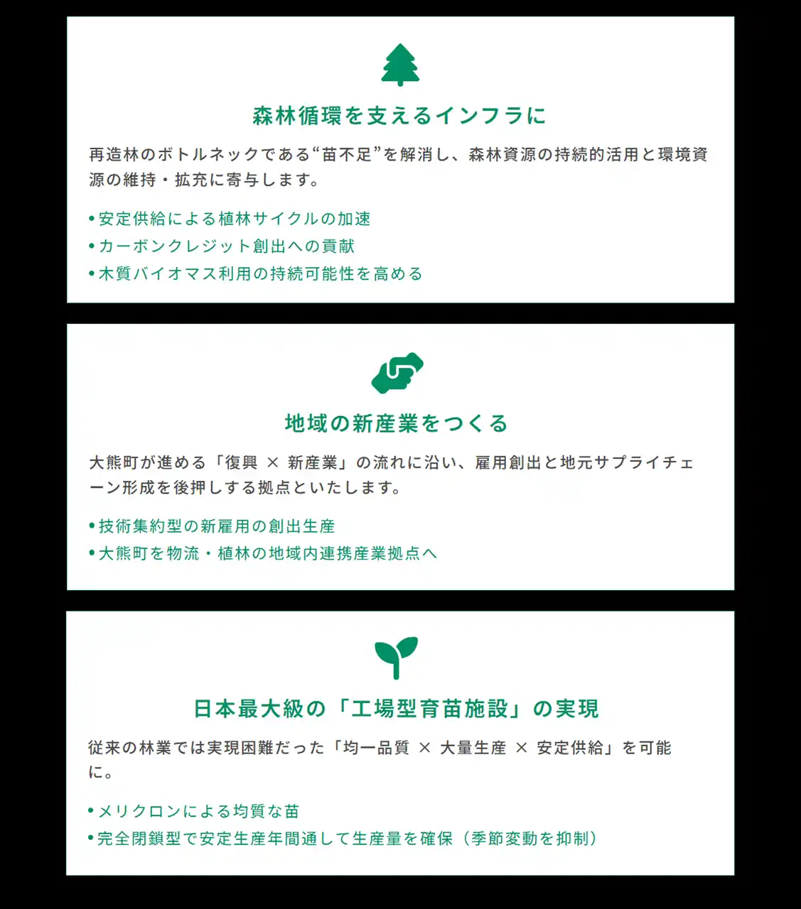 日本では、森林の高齢化・伐採後の再造林の停滞、そして木質バイオマス需要の急拡大が同時進行しています。にもかかわらず、植林に必要な苗木の供給は慢性的な不足が続き、再生可能な森林産業の基盤が揺らぎつつあります。林業において深刻化する「苗木不足」と「担い手の減少」。その課題を技術の力で解決し、地域の復興と持続可能な森林循環型社会を実現する新たな産業基盤を大熊から生み出します。 |