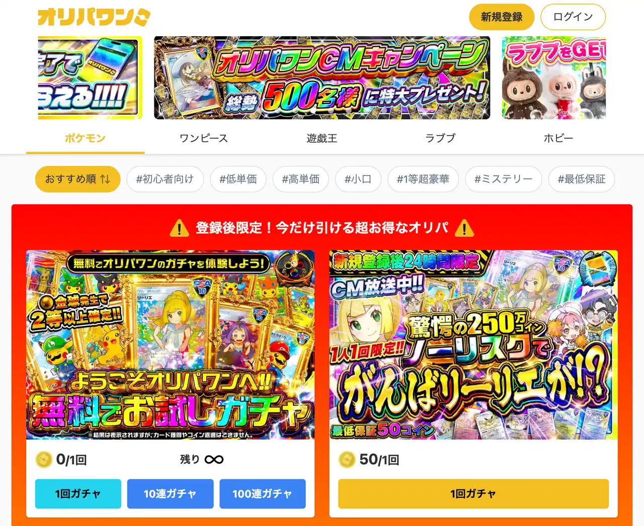 | オリパワン(https://oripaone.jp) は、オンラインで手軽にトレーディングカードの開封体験を楽しめるオンラインオリパサービスです。 | |||