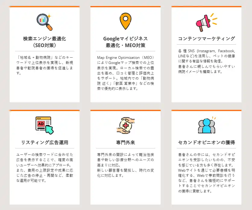 1. 獣医療業界を知り尽くした「特化型」コンテンツ 一般的な制作会社では伝わりにくい業界特有のニーズ(専門診療科目のアピール、高度医療設備の紹介、夜間救急体制の明確化など)を深く理解しています。獣医師監修による医療コンテンツの作成や、病院の理念・特色を効果的に伝える原稿作成代行も可能です。 |