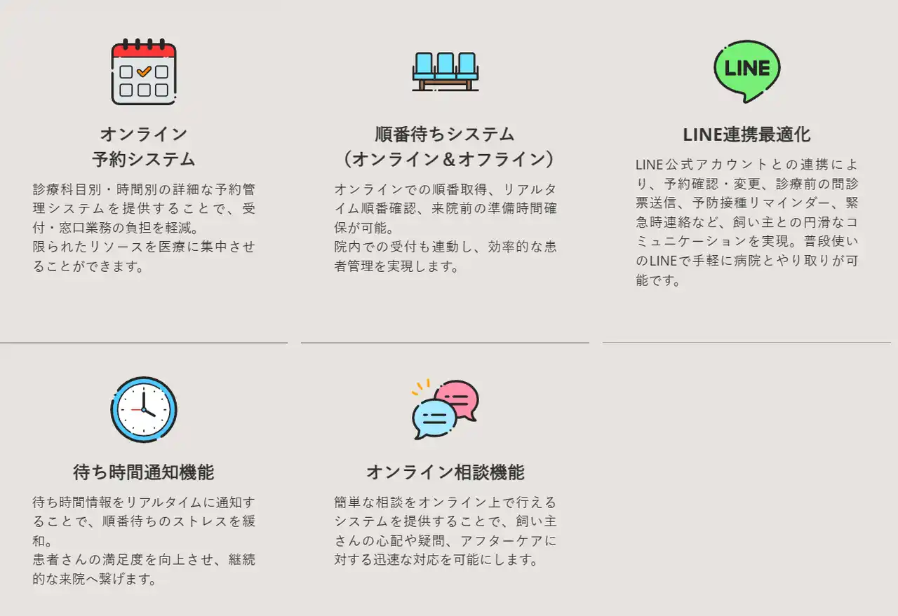 2. 現場の負担を減らす「業務効率化DX」 ただおしゃれなサイトを作るだけではありません。電話対応を劇的に減らす「オンライン予約」「順番待ちシステム」、飼い主様との連絡をスムーズにする「LINE公式アカウント連携」、来院前の「Web問診」など、現場スタッフの負担を軽減する機能を実装します。 |